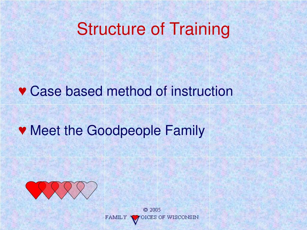 Structure of Training • Case based method of instruction • Meet the Goodpeople Family