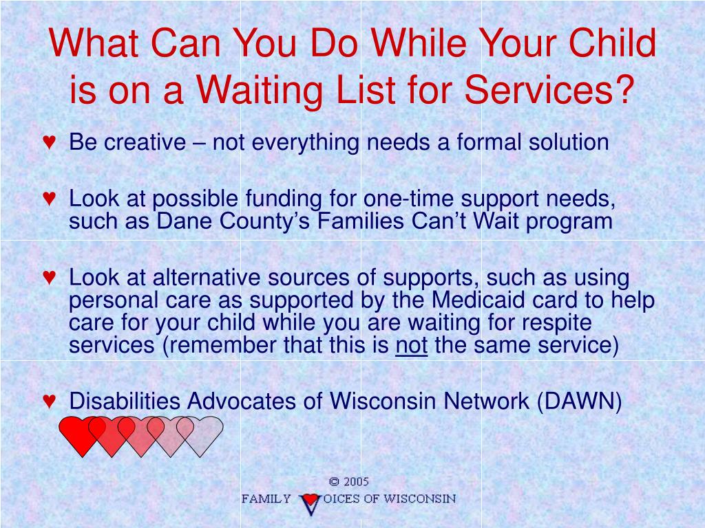 What Can You Do While Your Child is on a Waiting List for Services? • Be creative – not everything needs a formal solution • Look at possible funding for one-time support needs, such as Dane County’s Families Can’t Wait program • Look at alternative sources of supports, such as using personal care as supported by the Medicaid card to help care for your child while you are waiting for respite services (remember that this is not the same service) • Disabilities Advocates of Wisconsin Network (DAWN)