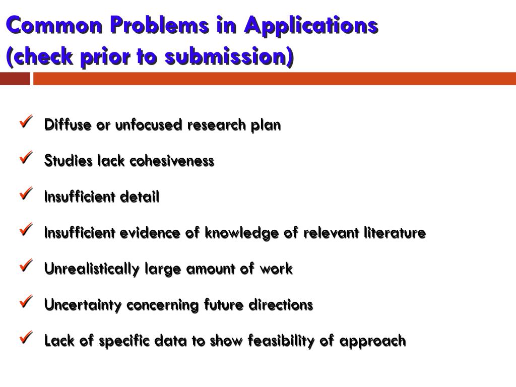 Common Problems in Applications(check prior to submission) • Diffuse or unfocused research plan • Studies lack cohesiveness • Insufficient detail • Insufficient evidence of knowledge of relevant literature • Unrealistically large amount of work • Uncertainty concerning future directions • Lack of specific data to show feasibility of approach