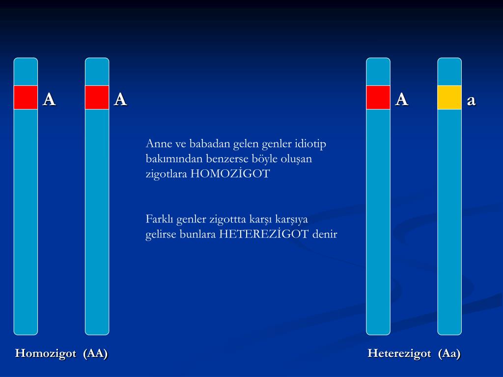 A A A a Homozigot (AA) Heterezigot (Aa) Anne ve babadan gelen genler idiotip bakımından benzerse böyle oluşan zigotlara HOMOZİGOT Farklı genler zigottta karşı karşıya gelirse bunlara HETEREZİGOT denir