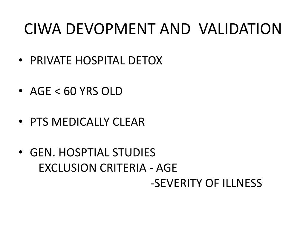 CIWA DEVOPMENT AND VALIDATION • PRIVATE HOSPITAL DETOX • AGE < 60 YRS OLD • PTS MEDICALLY CLEAR • GEN. HOSPTIAL STUDIES EXCLUSION CRITERIA - AGE -SEVERITY OF ILLNESS