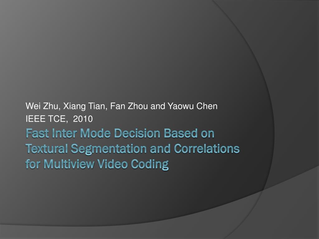 Wei Zhu, Xiang Tian, Fan Zhou and YaowuChen IEEE TCE, 2010 Fast Inter Mode Decision Based on Textural Segmentation and Correlations for Multiview Video Coding