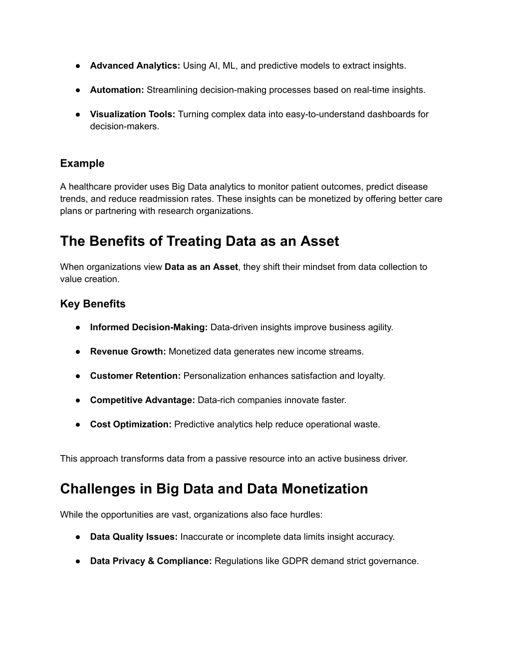 3. ● Advanced Analytics: Using AI, ML, and predictive models to extract insights. ● Automation: Streamlining decision-making processes based on real-time insights. ● Visualization Tools: Turning complex data into easy-to-understand dashboards for decision-makers. Example A healthcare provider uses Big Data analytics to monitor patient outcomes, predict disease trends, and reduce readmission rates. These insights can be monetized by offering better care plans or partnering with research organizations. The Benefits of Treating Data as an Asset When organizations view Data as an Asset, they shift their mindset from data collection to value creation. Key Benefits ● Informed Decision-Making: Data-driven insights improve business agility. ● Revenue Growth: Monetized data generates new income streams. ● Customer Retention: Personalization enhances satisfaction and loyalty. ● Competitive Advantage: Data-rich companies innovate faster. ● Cost Optimization: Predictive analytics help reduce operational waste. This approach transforms data from a passive resource into an active business driver. Challenges in Big Data and Data Monetization While the opportunities are vast, organizations also face hurdles: ● Data Quality Issues: Inaccurate or incomplete data limits insight accuracy. ● Data Privacy & Compliance: Regulations like GDPR demand strict governance.