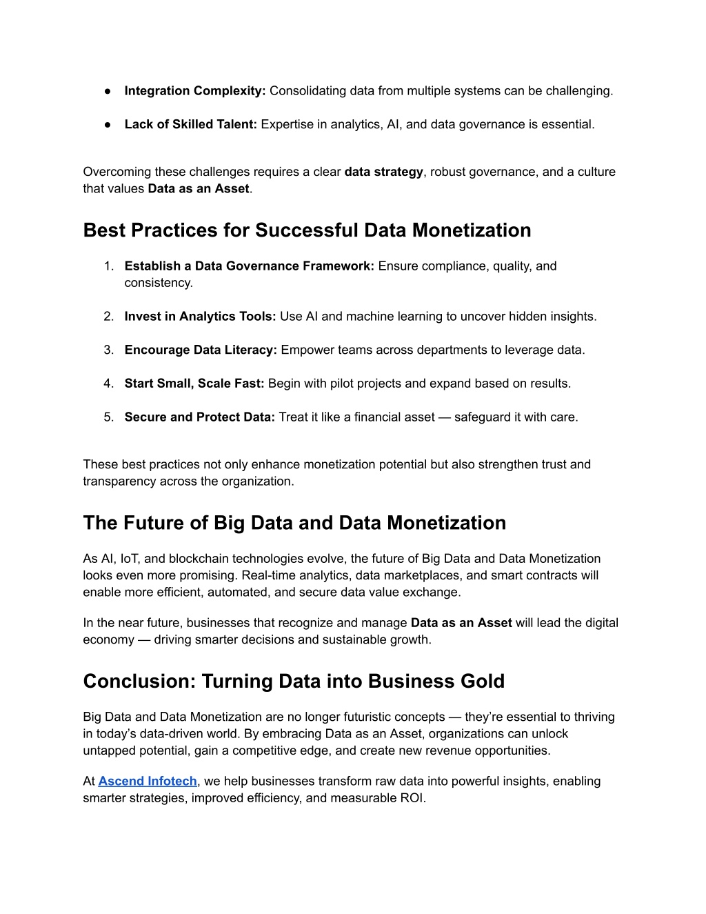 4. ● Integration Complexity: Consolidating data from multiple systems can be challenging. ● Lack of Skilled Talent: Expertise in analytics, AI, and data governance is essential. Overcoming these challenges requires a clear data strategy, robust governance, and a culture that values Data as an Asset. Best Practices for Successful Data Monetization 1. Establish a Data Governance Framework: Ensure compliance, quality, and consistency. 2. Invest in Analytics Tools: Use AI and machine learning to uncover hidden insights. 3. Encourage Data Literacy: Empower teams across departments to leverage data. 4. Start Small, Scale Fast: Begin with pilot projects and expand based on results. 5. Secure and Protect Data: Treat it like a financial asset — safeguard it with care. These best practices not only enhance monetization potential but also strengthen trust and transparency across the organization. The Future of Big Data and Data Monetization As AI, IoT, and blockchain technologies evolve, the future of Big Data and Data Monetization looks even more promising. Real-time analytics, data marketplaces, and smart contracts will enable more efficient, automated, and secure data value exchange. In the near future, businesses that recognize and manage Data as an Asset will lead the digital economy — driving smarter decisions and sustainable growth. Conclusion: Turning Data into Business Gold Big Data and Data Monetization are no longer futuristic concepts — they’re essential to thriving in today’s data-driven world. By embracing Data as an Asset, organizations can unlock untapped potential, gain a competitive edge, and create new revenue opportunities. At Ascend Infotech, we help businesses transform raw data into powerful insights, enabling smarter strategies, improved efficiency, and measurable ROI.