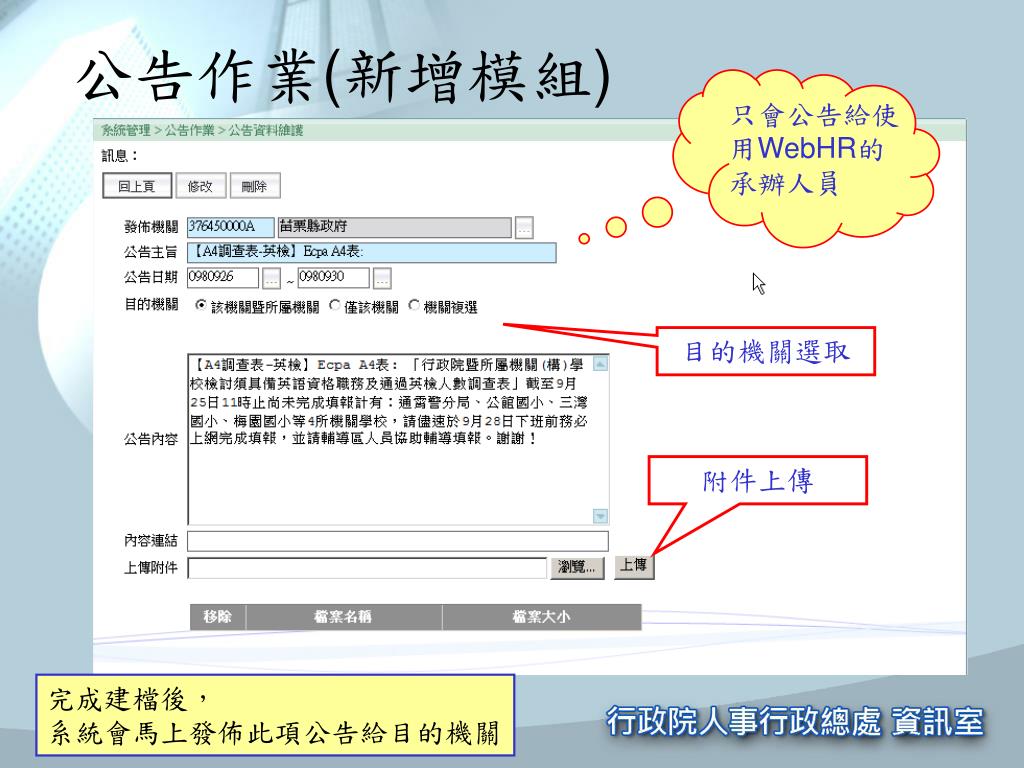 公告作業(新增模組) 只會公告給使用WebHR的承辦人員 目的機關選取 附件上傳 完成建檔後, 系統會馬上發佈此項公告給目的機關