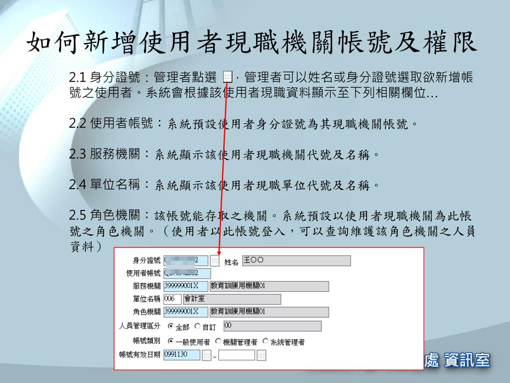 如何新增使用者現職機關帳號及權限 • 2.1 身分證號:管理者點選 ,管理者可以姓名或身分證號選取欲新增帳號之使用者。系統會根據該使用者現職資料顯示至下列相關欄位… • 2.2 使用者帳號:系統預設使用者身分證號為其現職機關帳號。 • 2.3 服務機關:系統顯示該使用者現職機關代號及名稱。 • 2.4 單位名稱:系統顯示該使用者現職單位代號及名稱。 • 2.5 角色機關:該帳號能存取之機關。系統預設以使用者現職機關為此帳號之角色機關。(使用者以此帳號登入,可以查詢維護該角色機關之人員資料)