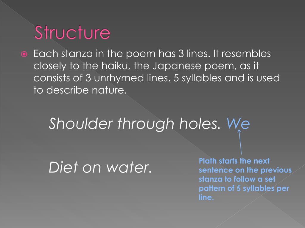 Structure • Each stanza in the poem has 3 lines. It resembles closely to the haiku, the Japanese poem, as it consists of 3 unrhymed lines, 5 syllables and is used to describe nature. Shoulder through holes. We Diet on water. Plath starts the next sentence on the previous stanza to follow a set pattern of 5 syllables per line.