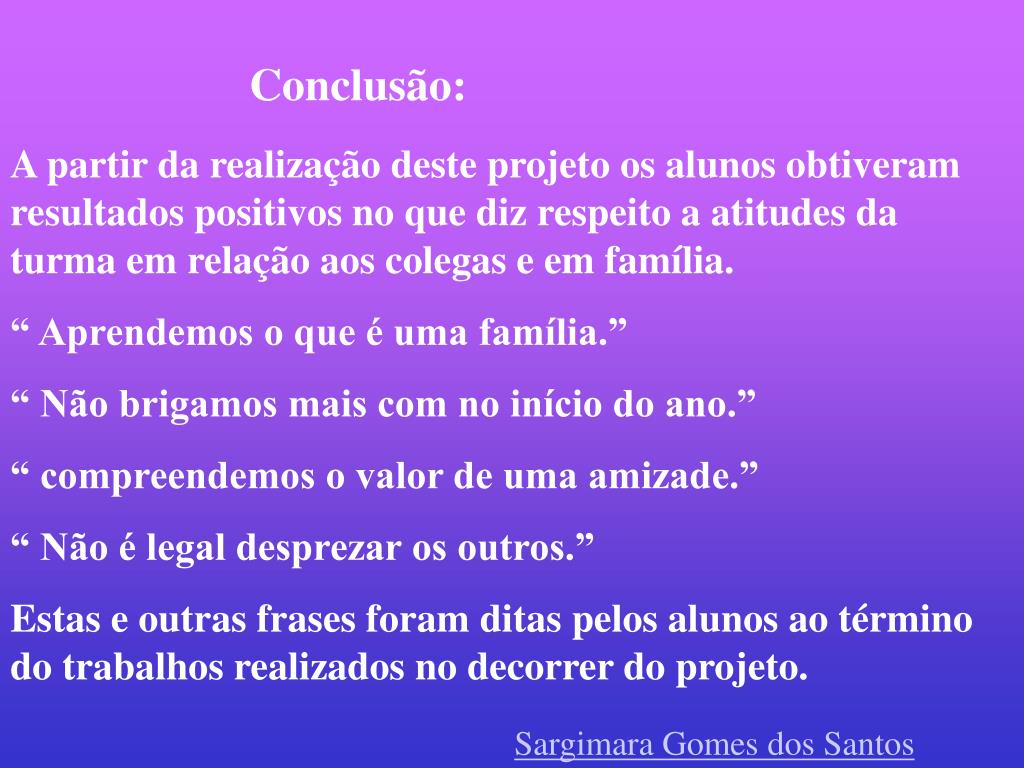 Conclusão: A partir da realização deste projeto os alunos obtiveram resultados positivos no que diz respeito a atitudes da turma em relação aos colegas e em família. “ Aprendemos o que é uma família.” “ Não brigamos mais com no início do ano.” “ compreendemos o valor de uma amizade.” “ Não é legal desprezar os outros.” Estas e outras frases foram ditas pelos alunos ao término do trabalhos realizados no decorrer do projeto. Sargimara Gomes dos Santos