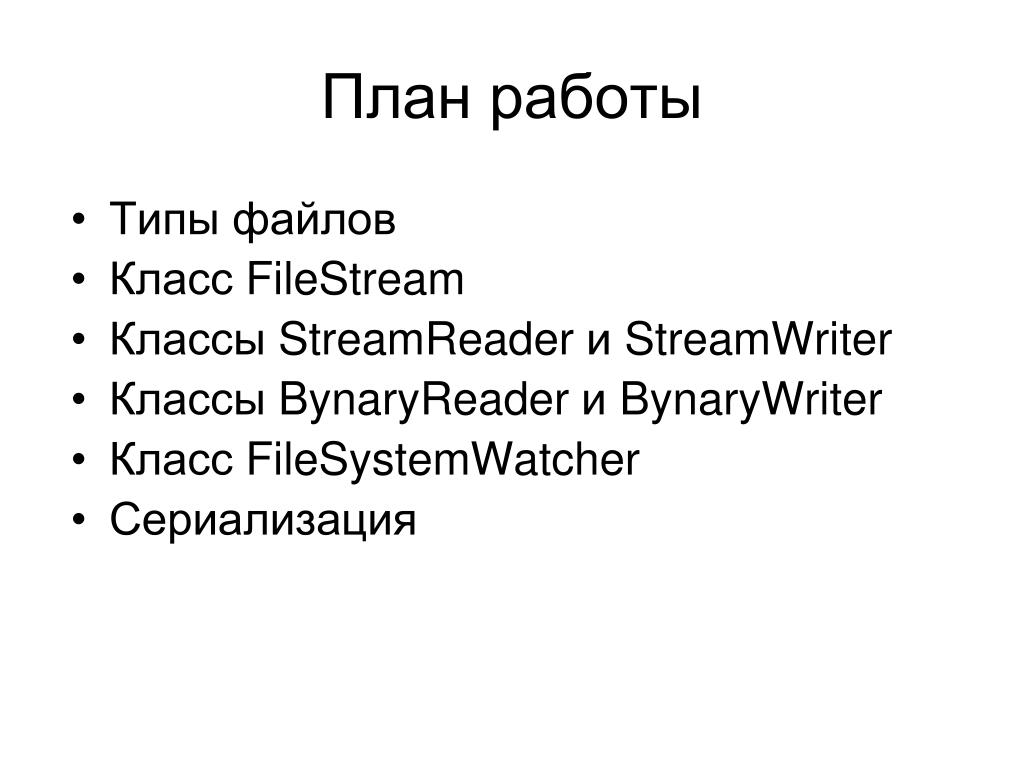 План работы • Типы файлов • Класс FileStream • Классы StreamReader иStreamWriter • Классы BynaryReader и BynaryWriter • Класс FileSystemWatcher • Сериализация