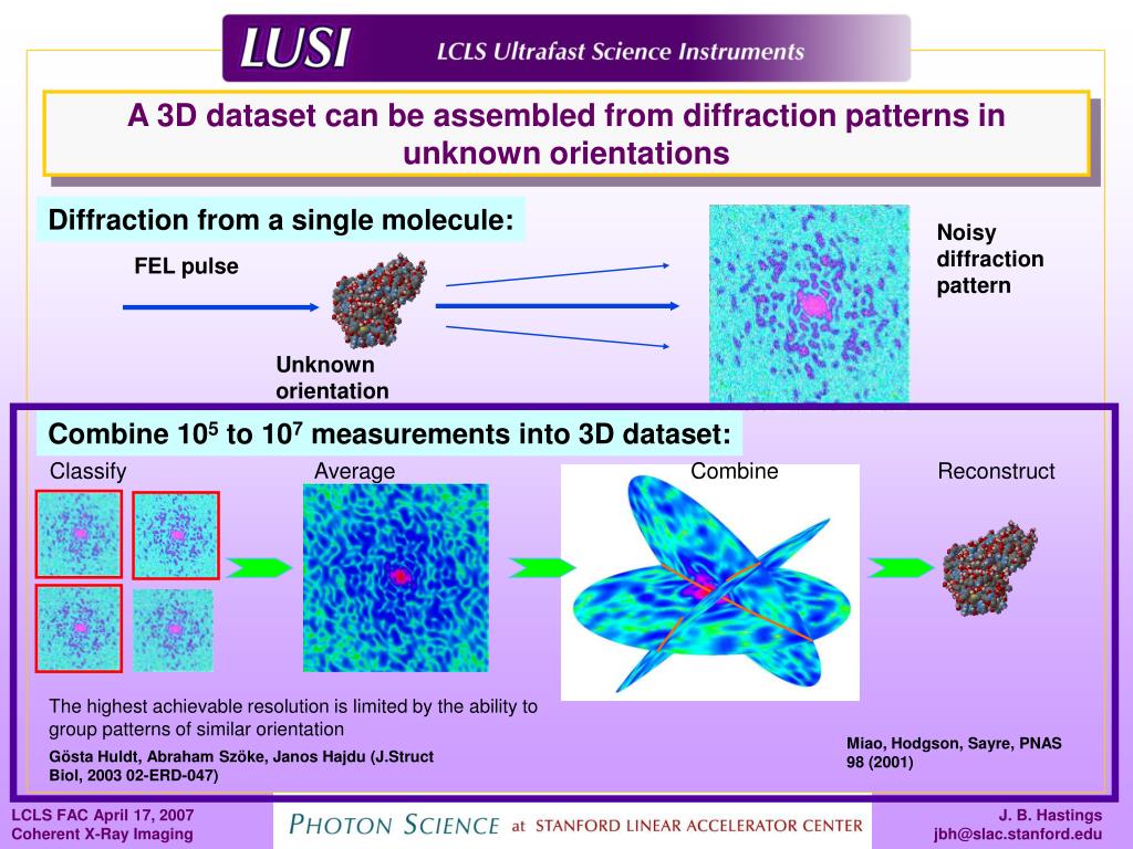 A 3D dataset can be assembled from diffraction patterns in unknown orientations Diffraction from a single molecule: Noisy diffraction pattern FEL pulse Unknown orientation Combine 105 to 107 measurements into 3D dataset: Classify Average Combine Reconstruct The highest achievable resolution is limited by the ability to group patterns of similar orientation Miao, Hodgson, Sayre, PNAS 98 (2001) Gösta Huldt, Abraham Szöke, Janos Hajdu (J.Struct Biol, 2003 02-ERD-047)