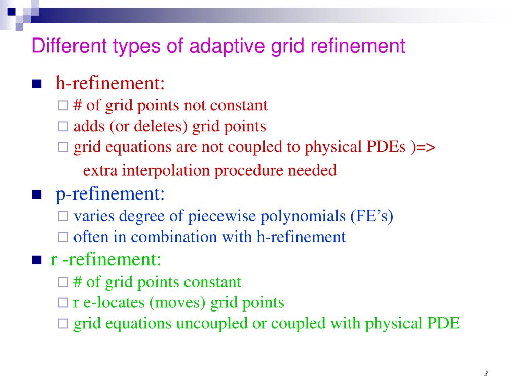 Different types of adaptive grid refinement • h-refinement: • # of grid points not constant • adds (or deletes) grid points • grid equations are not coupled to physical PDEs )=> extra interpolation procedure needed • p-refinement: • varies degree of piecewise polynomials (FE’s) • often in combination with h-refinement • r -refinement: • # of grid points constant • r e-locates (moves) grid points • grid equations uncoupled or coupled with physical PDE