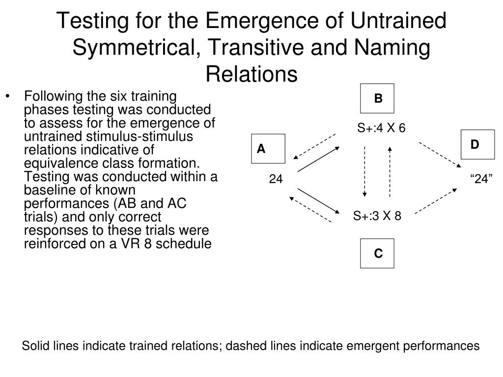 Testing for the Emergence of Untrained Symmetrical, Transitive and Naming Relations • Following the six training phases testing was conducted to assess for the emergence of untrained stimulus-stimulus relations indicative of equivalence class formation. Testing was conducted within a baseline of known performances (AB and AC trials) and only correct responses to these trials were reinforced on a VR 8 schedule B S+:4 X 6 D A 24 “24” S+:3 X 8 C Solid lines indicate trained relations; dashed lines indicate emergent performances
