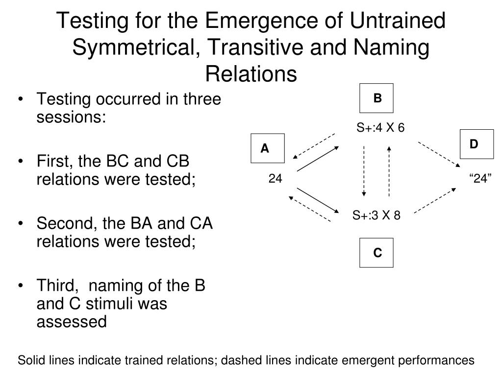 Testing for the Emergence of Untrained Symmetrical, Transitive and Naming Relations • Testing occurred in three sessions: • First, the BC and CB relations were tested; • Second, the BA and CA relations were tested; • Third, naming of the B and C stimuli was assessed B S+:4 X 6 D A 24 “24” S+:3 X 8 C Solid lines indicate trained relations; dashed lines indicate emergent performances