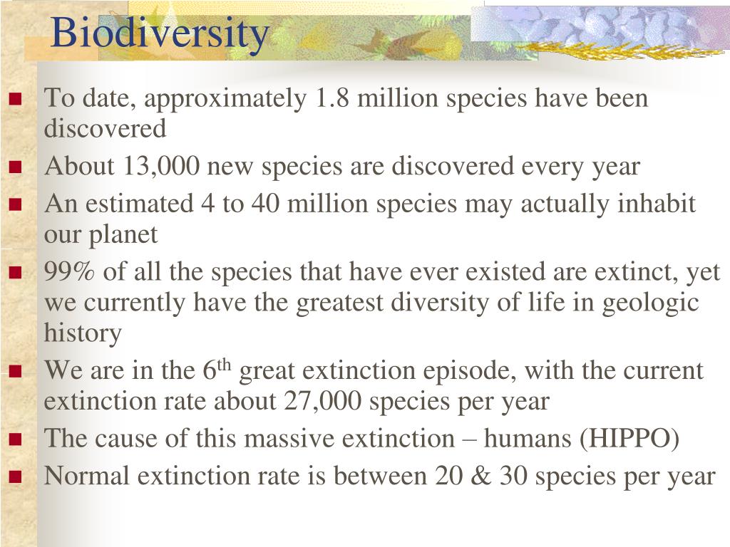 Biodiversity • To date, approximately 1.8 million species have been discovered • About 13,000 new species are discovered every year • An estimated 4 to 40 million species may actually inhabit our planet • 99% of all the species that have ever existed are extinct, yet we currently have the greatest diversity of life in geologic history • We are in the 6th great extinction episode, with the current extinction rate about 27,000 species per year • The cause of this massive extinction – humans (HIPPO) • Normal extinction rate is between 20 & 30 species per year