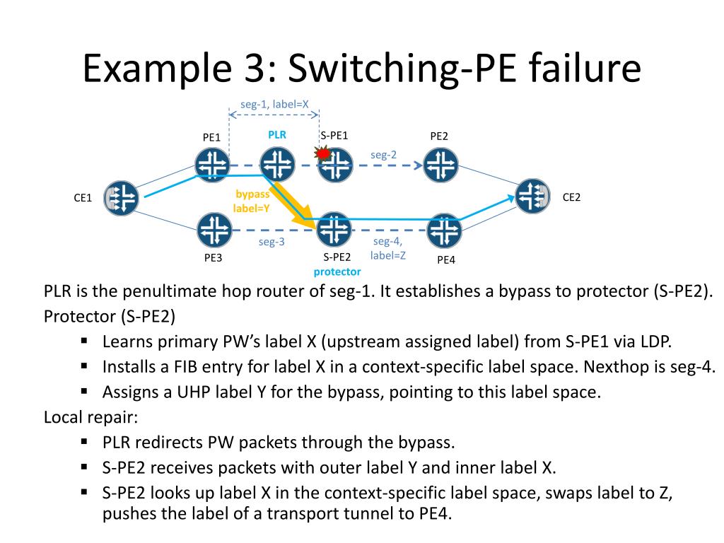 Example 3: Switching-PE failure seg-1, label=X PLR S-PE1 PE2 PE1 PLR is the penultimate hop router of seg-1. It establishes a bypass to protector (S-PE2). Protector (S-PE2) • Learns primary PW’s label X (upstream assigned label) from S-PE1 via LDP. • Installs a FIB entry for label X in a context-specific label space. Nexthop is seg-4. • Assigns a UHP label Y for the bypass, pointing to this label space. Local repair: • PLR redirects PW packets through the bypass. • S-PE2 receives packets with outer label Y and inner label X. • S-PE2 looks up label X in the context-specific label space, swaps label to Z, pushes the label of a transport tunnel to PE4. seg-2 bypass label=Y CE2 CE1 seg-4, label=Z seg-3 S-PE2 protector PE3 PE4