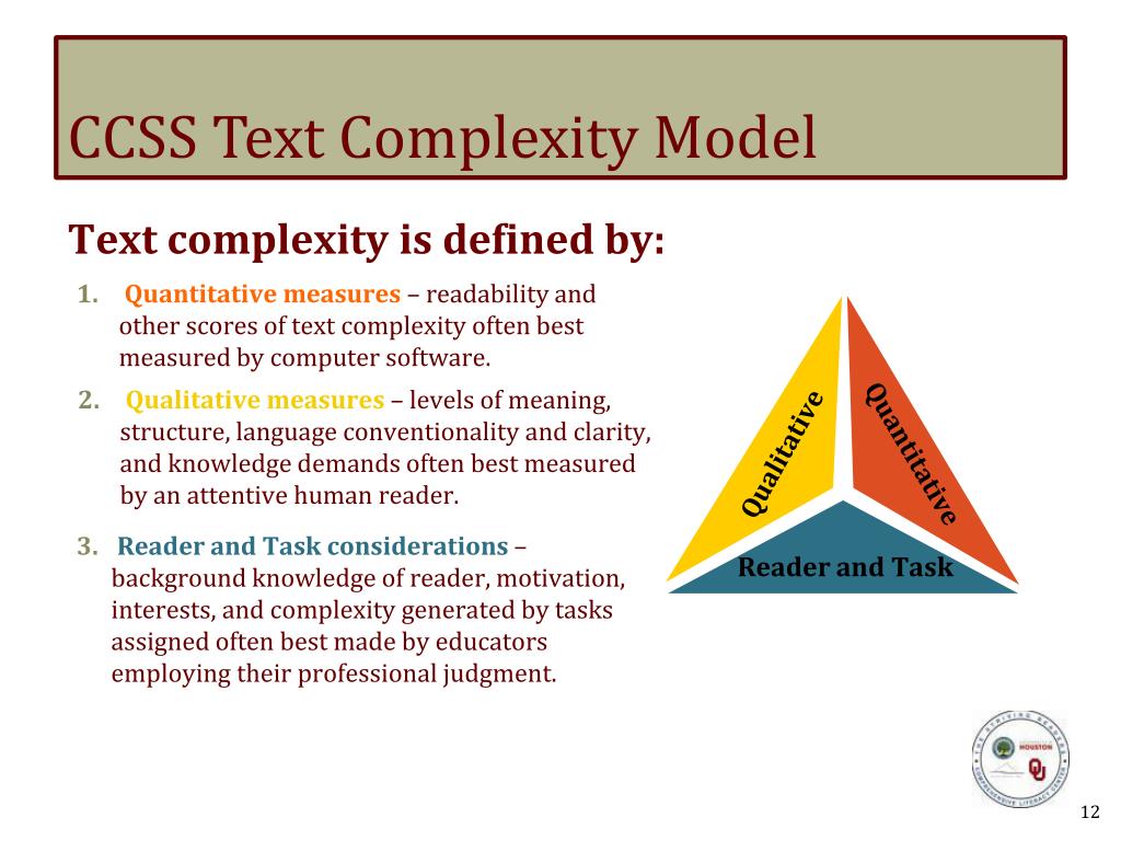CCSS Text Complexity Model Text complexity is defined by: • Quantitative measures– readability and other scores of text complexity often best measured by computer software. • Qualitative measures – levels of meaning, structure, language conventionality and clarity, and knowledge demands often best measured by an attentive human reader. Quantitative Qualitative • Reader and Task considerations – background knowledge of reader, motivation, interests, and complexity generated by tasks assigned often best made by educators employing their professional judgment. Reader and Task