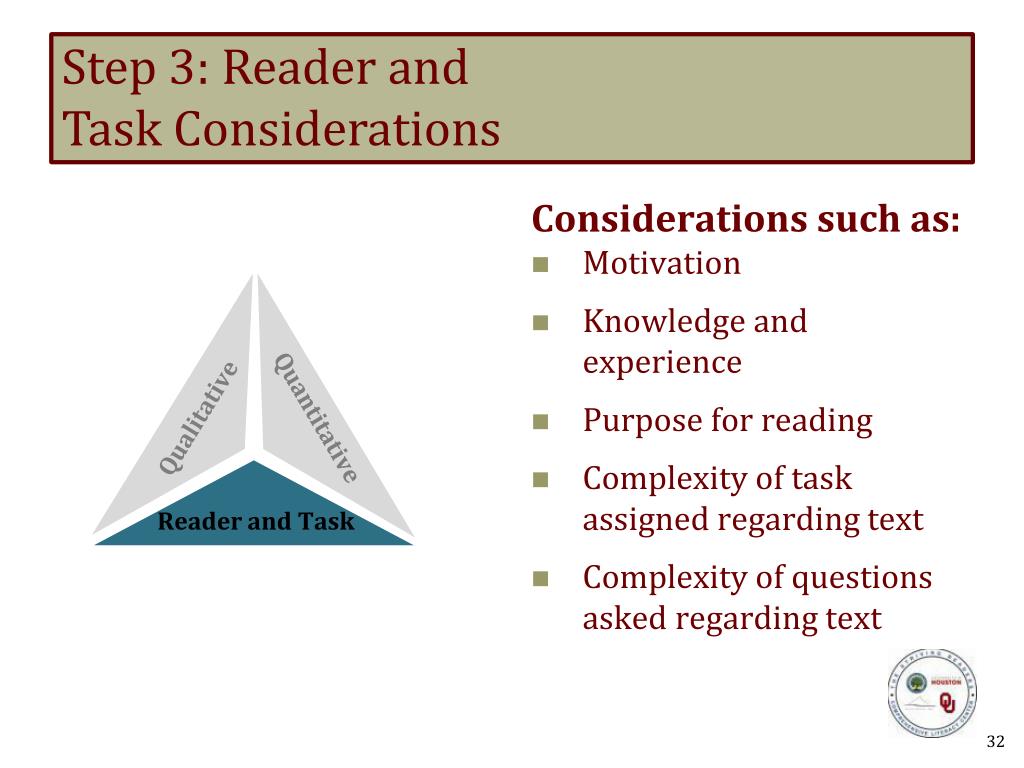 Step 3: Reader andTask Considerations Considerations such as: Motivation Knowledge and experience Purpose for reading Complexity of task assigned regarding text Complexity of questions asked regarding text Quantitative Qualitative Reader and Task