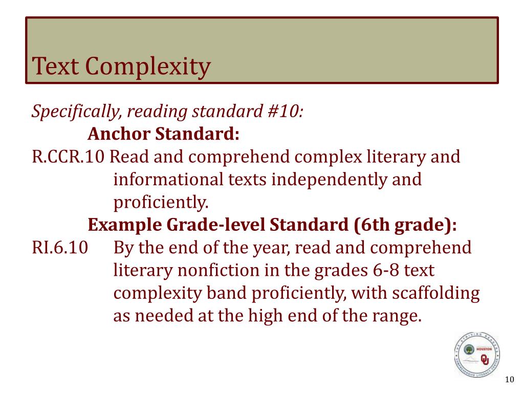 Text Complexity Specifically, reading standard #10: Anchor Standard: R.CCR.10 Read and comprehend complex literary and informational texts independently and proficiently. Example Grade-level Standard (6th grade): RI.6.10 By the end of the year, read and comprehend literary nonfiction in the grades 6-8 text complexity band proficiently, with scaffolding as needed at the high end of the range.