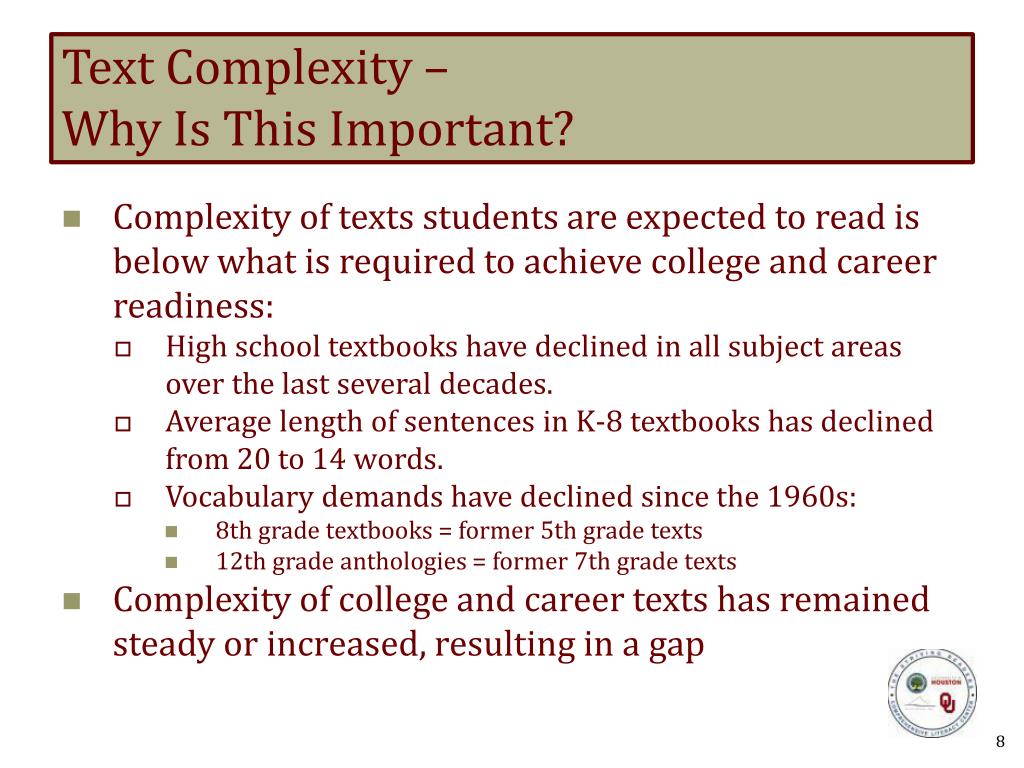 Text Complexity – Why Is This Important? Complexity of texts students are expected to read is below what is required to achieve college and career readiness: High school textbooks have declined in all subject areas over the last several decades. Average length of sentences in K-8 textbooks has declined from 20 to 14 words. Vocabulary demands have declined since the 1960s: 8th grade textbooks = former 5th grade texts 12th grade anthologies = former 7th grade texts Complexity of college and career texts has remained steady or increased, resulting in a gap