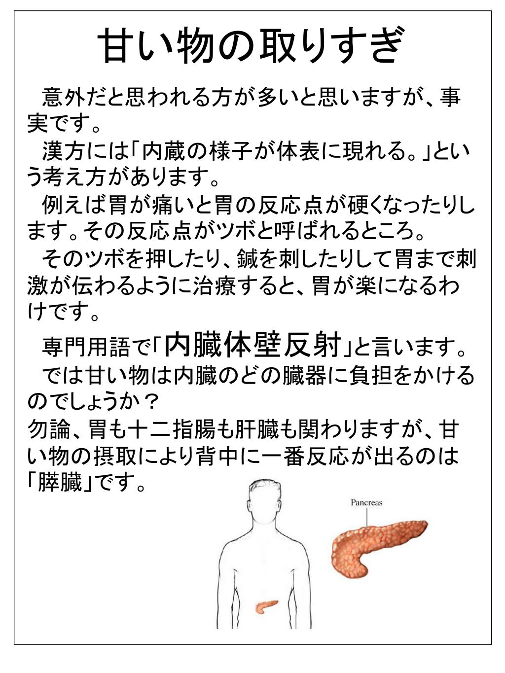 意外だと思われる方が多いと思いますが、事実です。 意外だと思われる方が多いと思いますが、事実です。 漢方には「内蔵の様子が体表に現れる。」という考え方があります。 例えば胃が痛いと胃の反応点が硬くなったりします。その反応点がツボと呼ばれるところ。 そのツボを押したり、鍼を刺したりして胃まで刺激が伝わるように治療すると、胃が楽になるわけです。 専門用語で「内臓体壁反射」と言います。 では甘い物は内臓のどの臓器に負担をかけるのでしょうか? 勿論、胃も十二指腸も肝臓も関わりますが、甘い物の摂取により背中に一番反応が出るのは「膵臓」です。 甘い物の取りすぎ