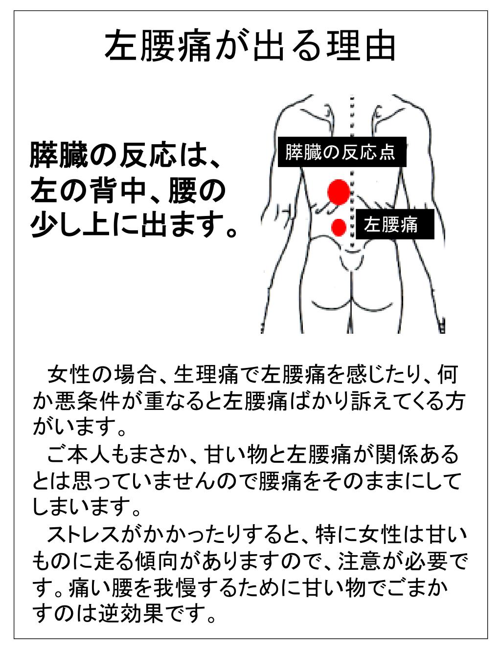 左腰痛が出る理由 膵臓の反応は、左の背中、腰の少し上に出ます。 膵臓の反応点 左腰痛 女性の場合、生理痛で左腰痛を感じたり、何か悪条件が重なると左腰痛ばかり訴えてくる方がいます。 ご本人もまさか、甘い物と左腰痛が関係あるとは思っていませんので腰痛をそのままにしてしまいます。 ストレスがかかったりすると、特に女性は甘いものに走る傾向がありますので、注意が必要です。痛い腰を我慢するために甘い物でごまかすのは逆効果です。