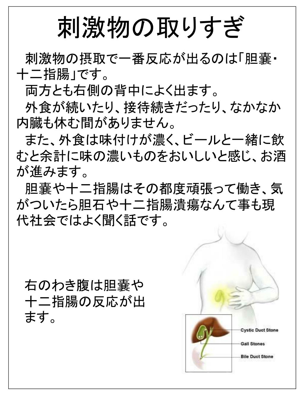 刺激物の摂取で一番反応が出るのは「胆嚢・十二指腸」です。 刺激物の摂取で一番反応が出るのは「胆嚢・十二指腸」です。 両方とも右側の背中によく出ます。 外食が続いたり、接待続きだったり、なかなか内臓も休む間がありません。 また、外食は味付けが濃く、ビールと一緒に飲むと余計に味の濃いものをおいしいと感じ、お酒が進みます。 胆嚢や十二指腸はその都度頑張って働き、気がついたら胆石や十二指腸潰瘍なんて事も現代社会ではよく聞く話です。 刺激物の取りすぎ 右のわき腹は胆嚢や十二指腸の反応が出ます。