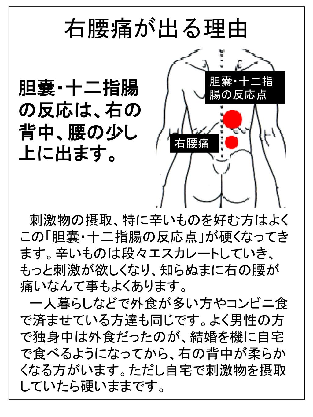 右腰痛が出る理由 胆嚢・十二指腸の反応点 胆嚢・十二指腸の反応は、右の背中、腰の少し上に出ます。 右腰痛 刺激物の摂取、特に辛いものを好む方はよくこの「胆嚢・十二指腸の反応点」が硬くなってきます。辛いものは段々エスカレートしていき、もっと刺激が欲しくなり、知らぬまに右の腰が痛いなんて事もよくあります。 一人暮らしなどで外食が多い方やコンビニ食で済ませている方達も同じです。よく男性の方で独身中は外食だったのが、結婚を機に自宅で食べるようになってから、右の背中が柔らかくなる方がいます。ただし自宅で刺激物を摂取していたら硬いままです。