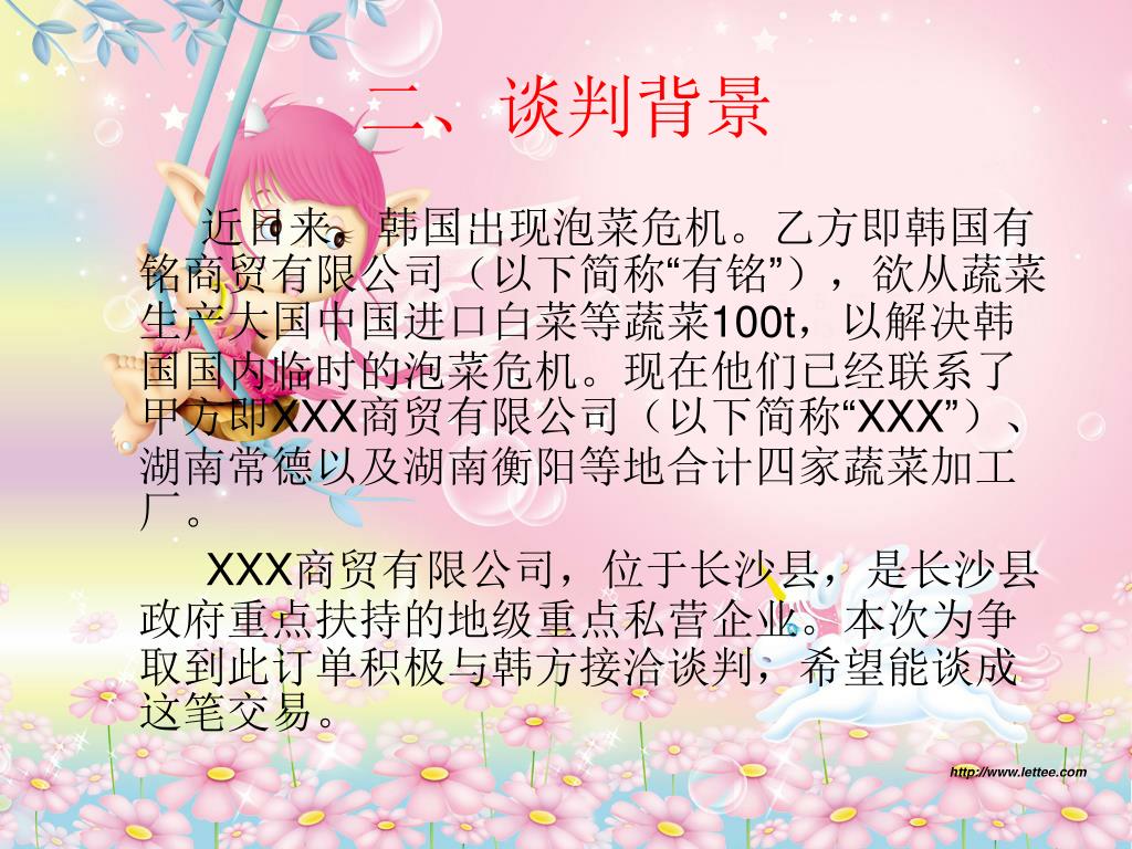 二、谈判背景 近日来,韩国出现泡菜危机。乙方即韩国有铭商贸有限公司(以下简称“有铭”),欲从蔬菜生产大国中国进口白菜等蔬菜100t,以解决韩国国内临时的泡菜危机。现在他们已经联系了甲方即XXX商贸有限公司(以下简称“XXX”)、湖南常德以及湖南衡阳等地合计四家蔬菜加工厂。 XXX商贸有限公司,位于长沙县,是长沙县政府重点扶持的地级重点私营企业。本次为争取到此订单积极与韩方接洽谈判,希望能谈成这笔交易。