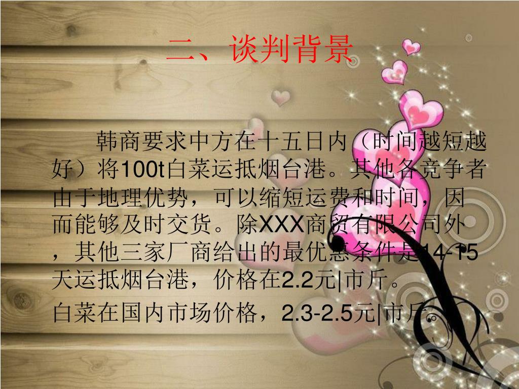 二、谈判背景 韩商要求中方在十五日内(时间越短越好)将100t白菜运抵烟台港。其他各竞争者由于地理优势,可以缩短运费和时间,因而能够及时交货。除XXX商贸有限公司外,其他三家厂商给出的最优惠条件是14-15天运抵烟台港,价格在2.2元|市斤。 白菜在国内市场价格,2.3-2.5元|市斤。