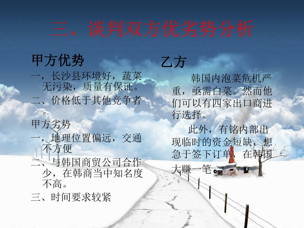 三、谈判双方优劣势分析 乙方 韩国内泡菜危机严重,亟需白菜。然而他们可以有四家出口商进行选择。 此外,有铭内部出现临时的资金短缺,想急于签下订单,在韩国大赚一笔。 甲方优势 一,长沙县环境好,蔬菜无污染,质量有保证。 二、价格低于其他竞争者。 甲方劣势 一,地理位置偏远,交通不方便 二、与韩国商贸公司合作少,在韩商当中知名度不高。 三、时间要求较紧