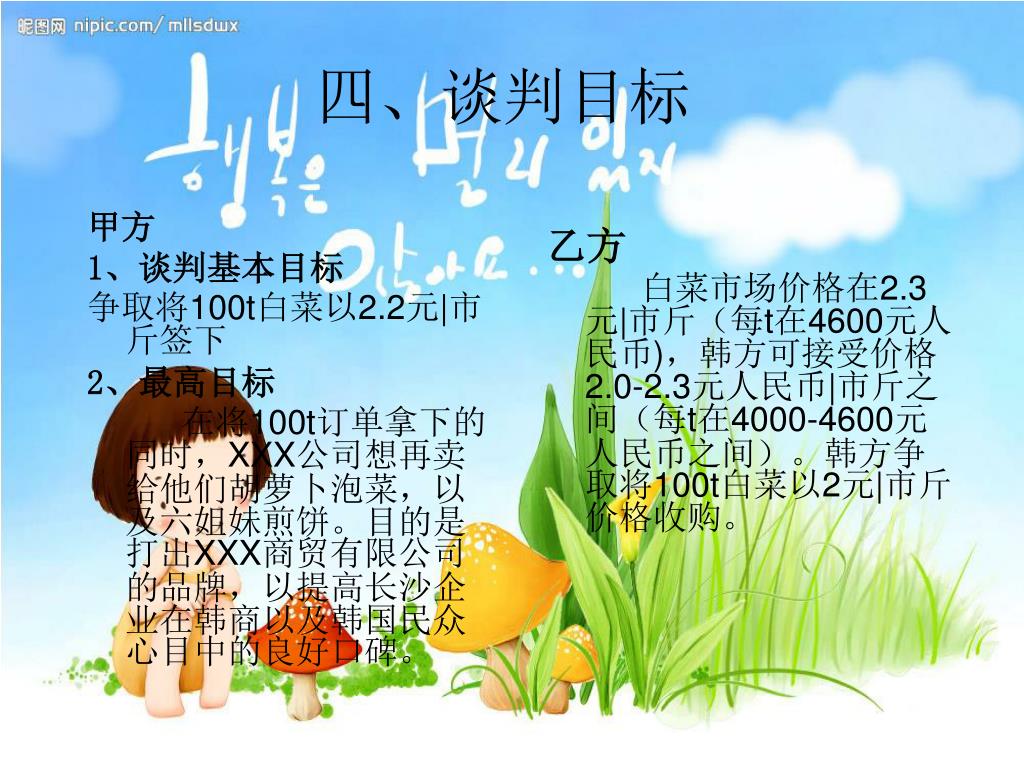 四、谈判目标 甲方 1、谈判基本目标 争取将100t白菜以2.2元|市斤签下 2、最高目标 在将100t订单拿下的同时,XXX公司想再卖给他们胡萝卜泡菜,以及六姐妹煎饼。目的是打出XXX商贸有限公司的品牌,以提高长沙企业在韩商以及韩国民众心目中的良好口碑。 乙方 白菜市场价格在2.3元|市斤(每t在4600元人民币),韩方可接受价格2.0-2.3元人民币|市斤之间(每t在4000-4600元人民币之间)。韩方争取将100t白菜以2元|市斤价格收购。