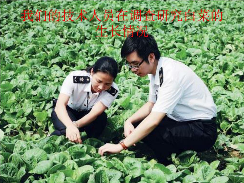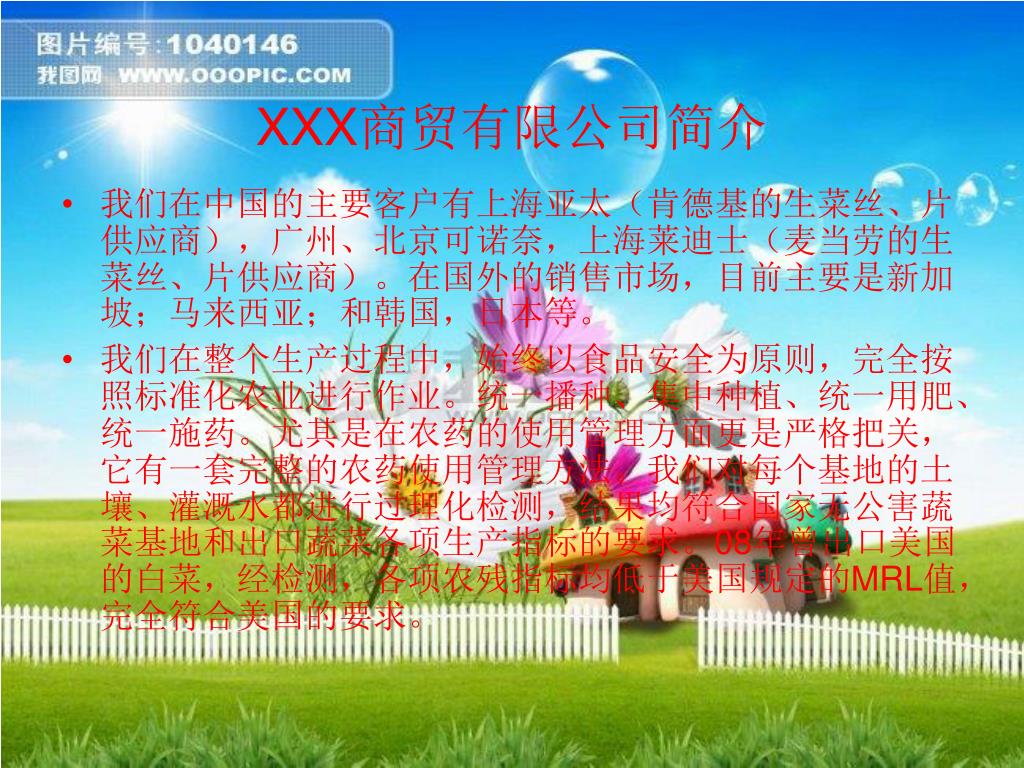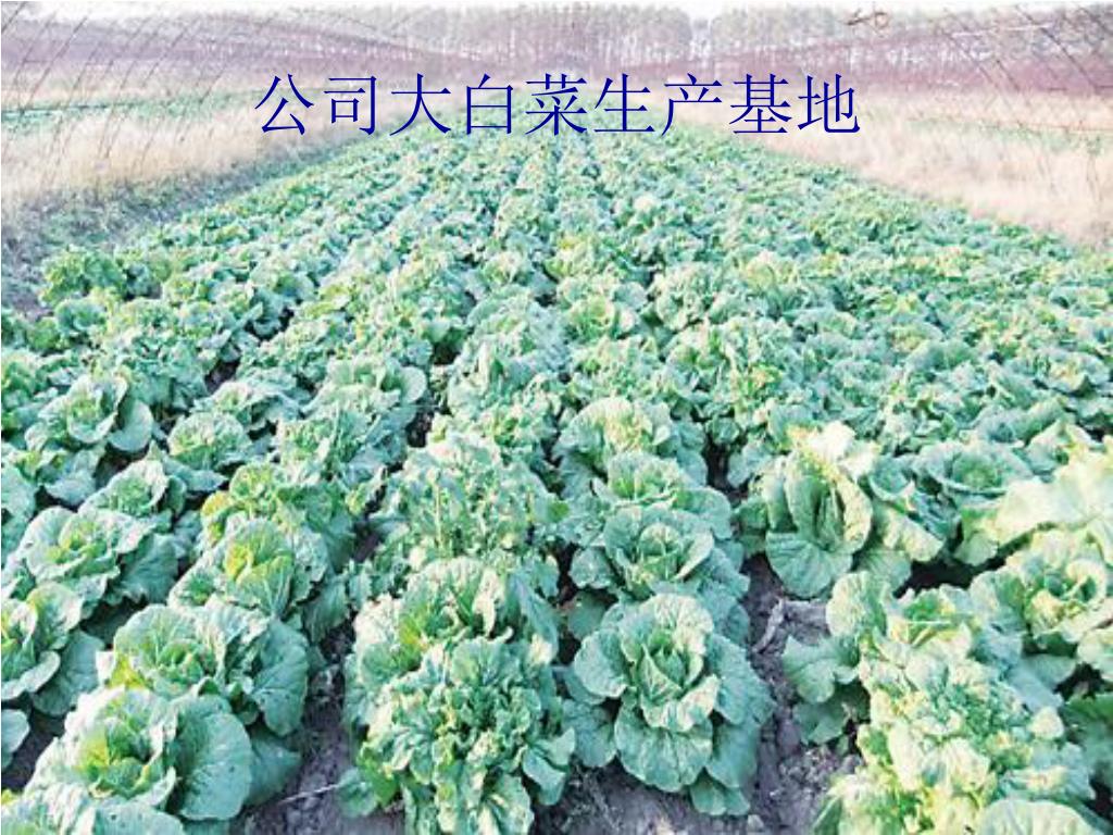 XXX商贸有限公司简介 • 我们在中国的主要客户有上海亚太(肯德基的生菜丝、片供应商),广州、北京可诺奈,上海莱迪士(麦当劳的生菜丝、片供应商)。在国外的销售市场,目前主要是新加坡;马来西亚;和韩国,日本等。 • 我们在整个生产过程中,始终以食品安全为原则,完全按照标准化农业进行作业。统一播种、集中种植、统一用肥、统一施药。尤其是在农药的使用管理方面更是严格把关,它有一套完整的农药使用管理方法。我们对每个基地的土壤、灌溉水都进行过理化检测,结果均符合国家无公害蔬菜基地和出口蔬菜各项生产指标的要求。08年曾出口美国的白菜,经检测,各项农残指标均低于美国规定的MRL值,完全符合美国的要求。