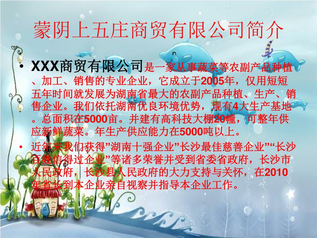 蒙阴上五庄商贸有限公司简介 • XXX商贸有限公司是一家从事蔬菜等农副产品种植、加工、销售的专业企业,它成立于2005年,仅用短短五年时间就发展为湖南省最大的农副产品种植、生产、销售企业。我们依托湖南优良环境优势,现有4大生产基地。总面积在5000亩。并建有高科技大棚20幢,可整年供应新鲜蔬菜。年生产供应能力在5000吨以上。 • 近年来我们获得”湖南十强企业”长沙最佳慈善企业”“长沙百姓信得过企业”等诸多荣誉并受到省委省政府,长沙市人民政府,长沙县人民政府的大力支持与关怀,在2010年省长到本企业亲自视察并指导本企业工作。