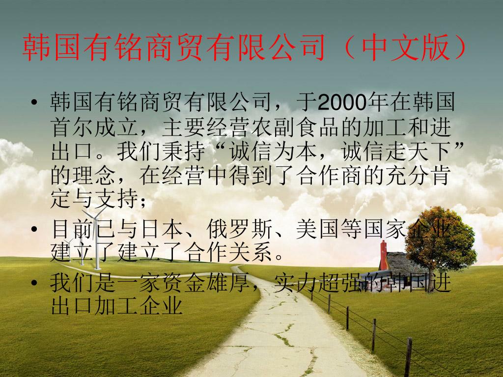 韩国有铭商贸有限公司(中文版) • 韩国有铭商贸有限公司,于2000年在韩国首尔成立,主要经营农副食品的加工和进出口。我们秉持“诚信为本,诚信走天下”的理念,在经营中得到了合作商的充分肯定与支持; • 目前已与日本、俄罗斯、美国等国家企业建立了建立了合作关系。 • 我们是一家资金雄厚,实力超强的韩国进出口加工企业
