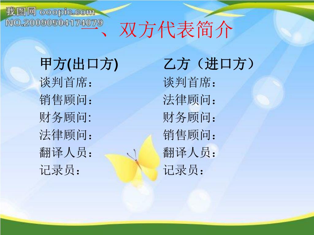 一、双方代表简介 乙方(进口方) 谈判首席: 法律顾问: 财务顾问: 销售顾问: 翻译人员: 记录员: 甲方(出口方) 谈判首席: 销售顾问: 财务顾问: 法律顾问: 翻译人员: 记录员: