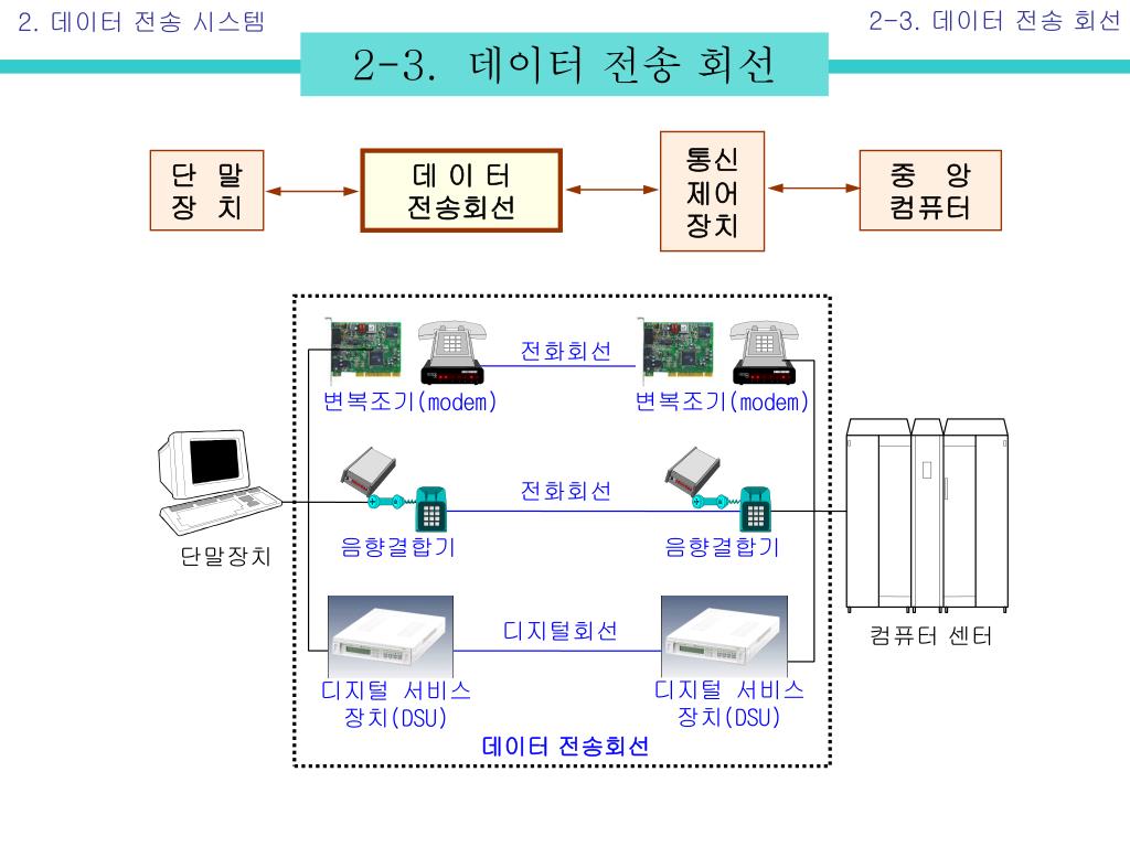 전화회선 변복조기(modem) 전화회선 음향결합기 단말장치 디지털회선 디지털 서비스 장치(DSU) 2. 데이터 전송 시스템 2-3. 데이터 전송 회선 2-3. 데이터 전송 회선 통신 제어 장치 단 말 장 치 데 이 터 전송회선 중 앙 컴퓨터 변복조기(modem) 음향결합기 컴퓨터 센터 디지털 서비스 장치(DSU) 데이터 전송회선