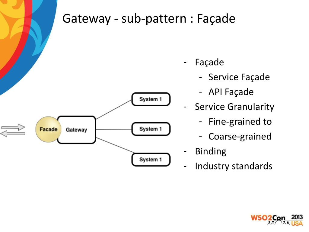 Gateway - sub-pattern : Façade • Façade • Service Façade • API Façade • Service Granularity • Fine-grained to • Coarse-grained • Binding • Industry standards