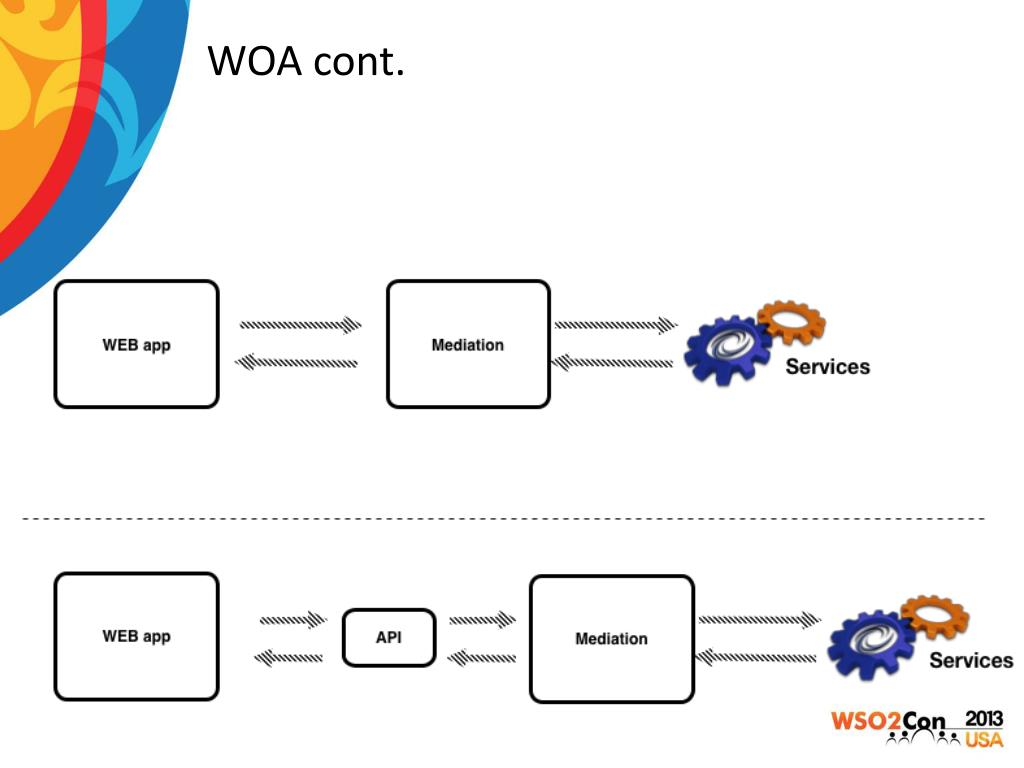 WOA (Web Oriented Architecture) • Bring SOA principles to WEB programming • Loosely-coupled • Light-weight web apps (zero business logic) • Light-weight protocols (REST, JSON, POX, protobuf) • WEB API design