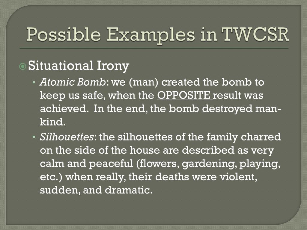 Possible Examples in TWCSR • Situational Irony • Atomic Bomb: we (man) created the bomb to keep us safe, when the OPPOSITE result was achieved. In the end, the bomb destroyed man-kind. • Silhouettes: the silhouettes of the family charred on the side of the house are described as very calm and peaceful (flowers, gardening, playing, etc.) when really, their deaths were violent, sudden, and dramatic.