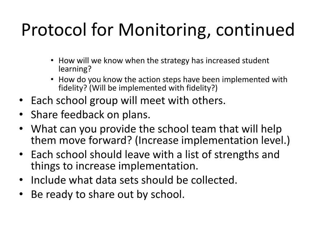 Protocol for Monitoring, continued • How will we know when the strategy has increased student learning? • How do you know the action steps have been implemented with fidelity? (Will be implemented with fidelity?) • Each school group will meet with others. • Share feedback on plans. • What can you provide the school team that will help them move forward? (Increase implementation level.) • Each school should leave with a list of strengths and things to increase implementation. • Include what data sets should be collected. • Be ready to share out by school.