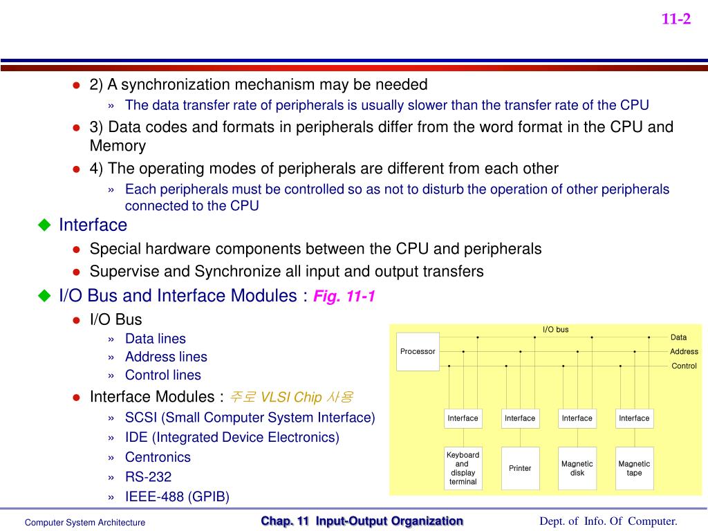 2) A synchronization mechanism may be needed • The data transfer rate of peripherals is usually slower than the transfer rate of the CPU • 3) Data codes and formats in peripherals differ from the word format in the CPU and Memory • 4) The operating modes of peripherals are different from each other • Each peripherals must be controlled so as not to disturb the operation of other peripherals connected to the CPU • Interface • Special hardware components between the CPU and peripherals • Supervise and Synchronize all input and output transfers • I/O Bus and Interface Modules : Fig. 11-1 • I/O Bus • Data lines • Address lines • Control lines • Interface Modules : 주로 VLSI Chip 사용 • SCSI (Small Computer System Interface) • IDE (Integrated Device Electronics) • Centronics • RS-232 • IEEE-488 (GPIB)