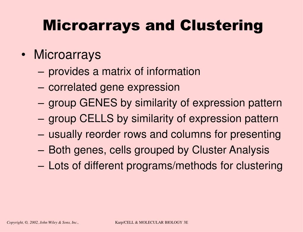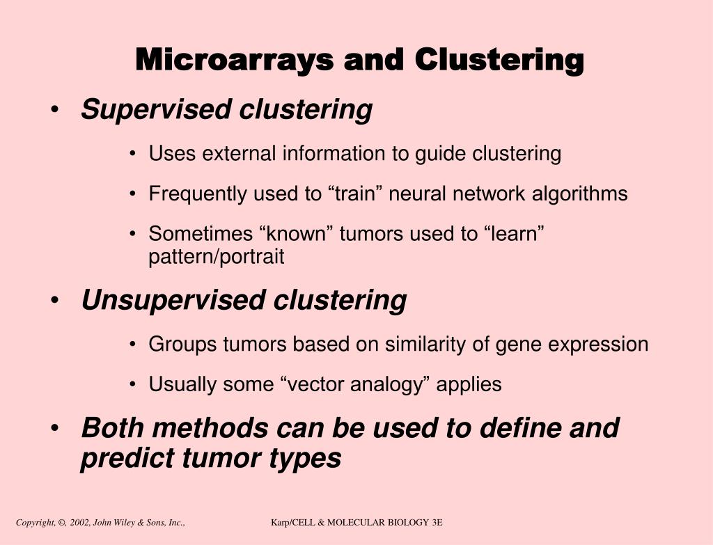 Microarrays and Clustering • Supervised clustering • Uses external information to guide clustering • Frequently used to “train” neural network algorithms • Sometimes “known” tumors used to “learn” pattern/portrait • Unsupervised clustering • Groups tumors based on similarity of gene expression • Usually some “vector analogy” applies • Both methods can be used to define and predict tumor types Karp/CELL & MOLECULAR BIOLOGY 3E
