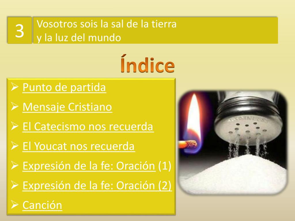 3. Vosotros sois la sal de la tierra y la luz del mundo. Índice. Punto de partida Mensaje Cristiano El Catecismo nos recuerda El Youcat nos recuerda Expresión de la fe: Oración (1) Expresión de la fe: Oración (2) Canción. 3. Vosotros sois la sal de la tierra y la luz del mundo.