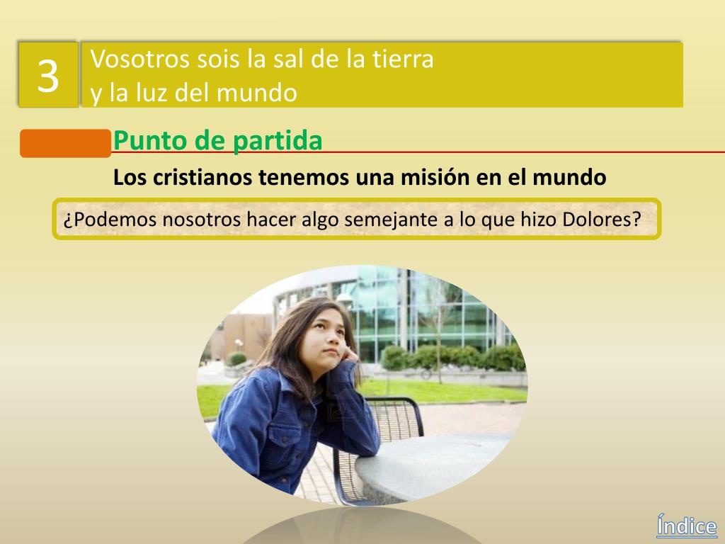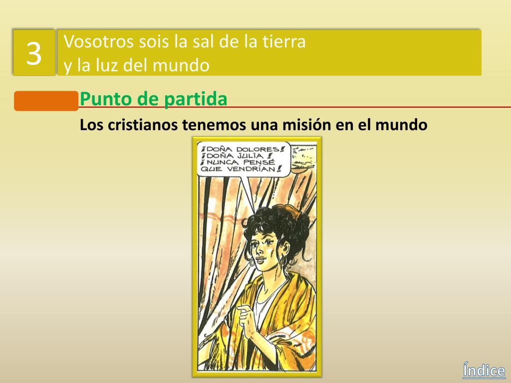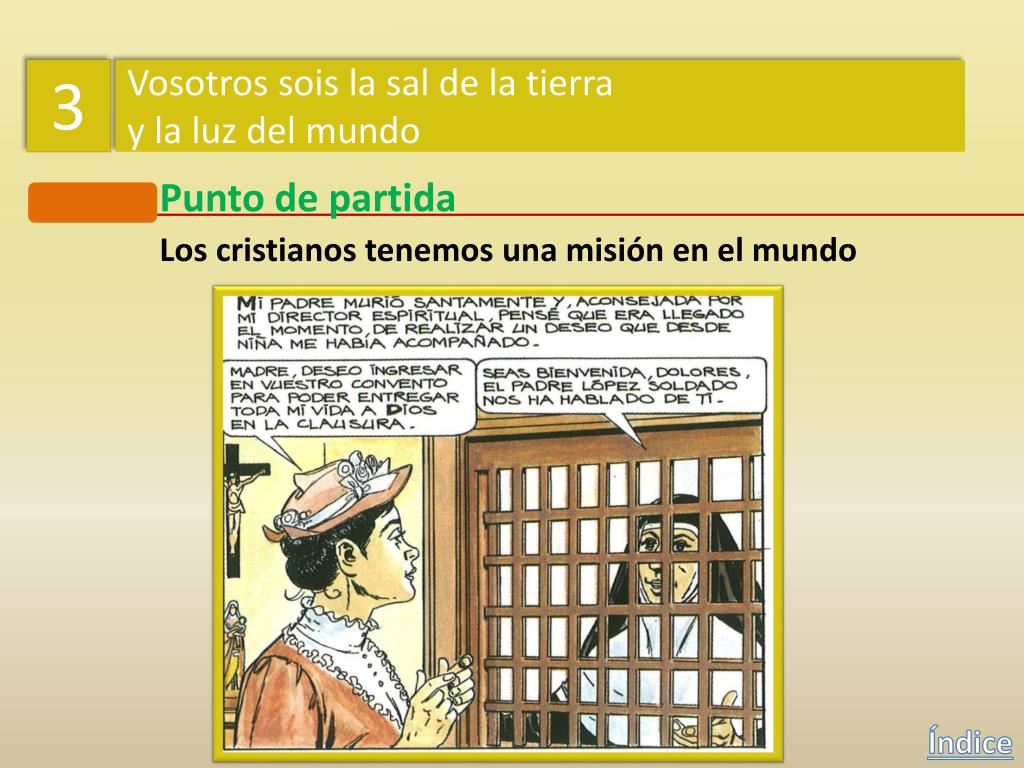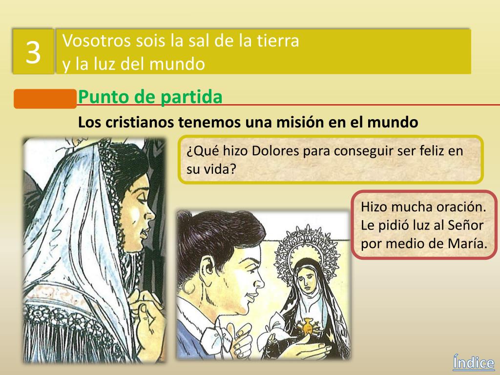 3 Vosotros sois la sal de la tierra y la luz del mundo Punto de partida Los cristianos tenemos una misión en el mundo ¿Podemos nosotros hacer algo semejante a lo que hizo Dolores? Índice