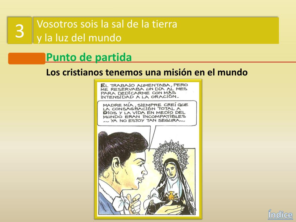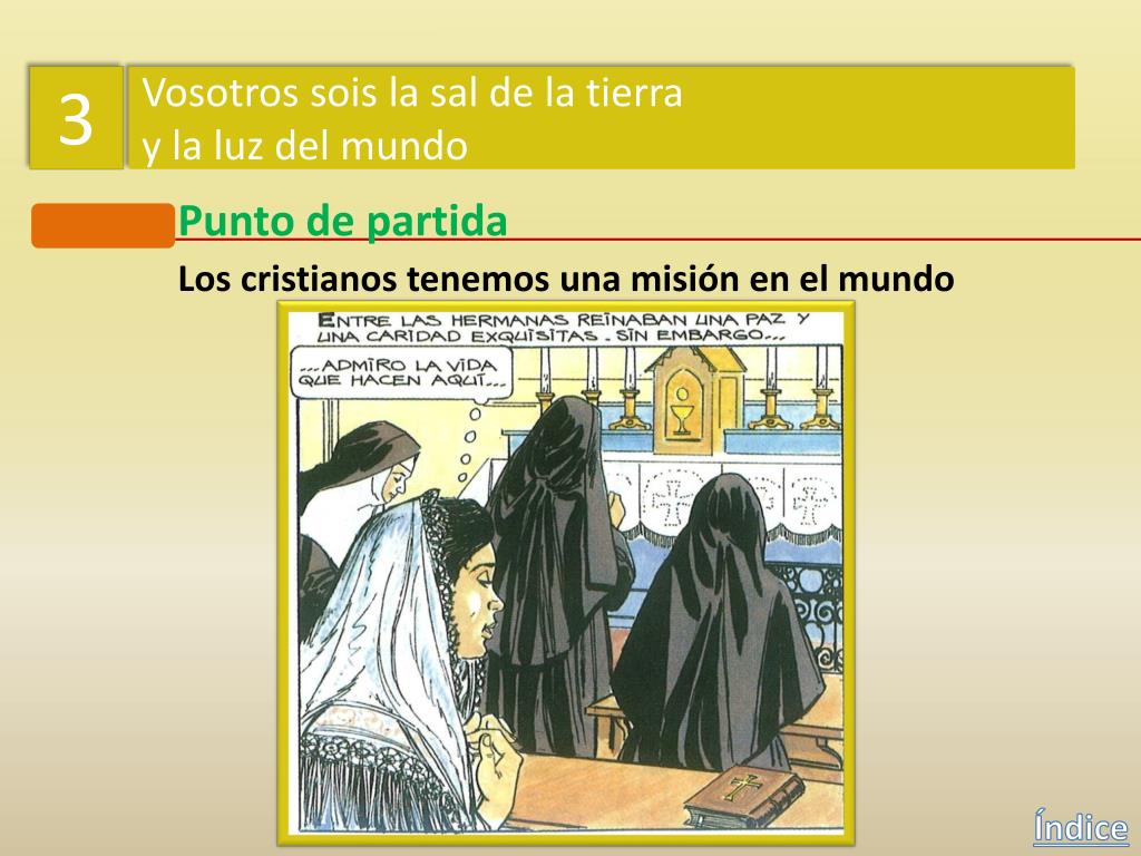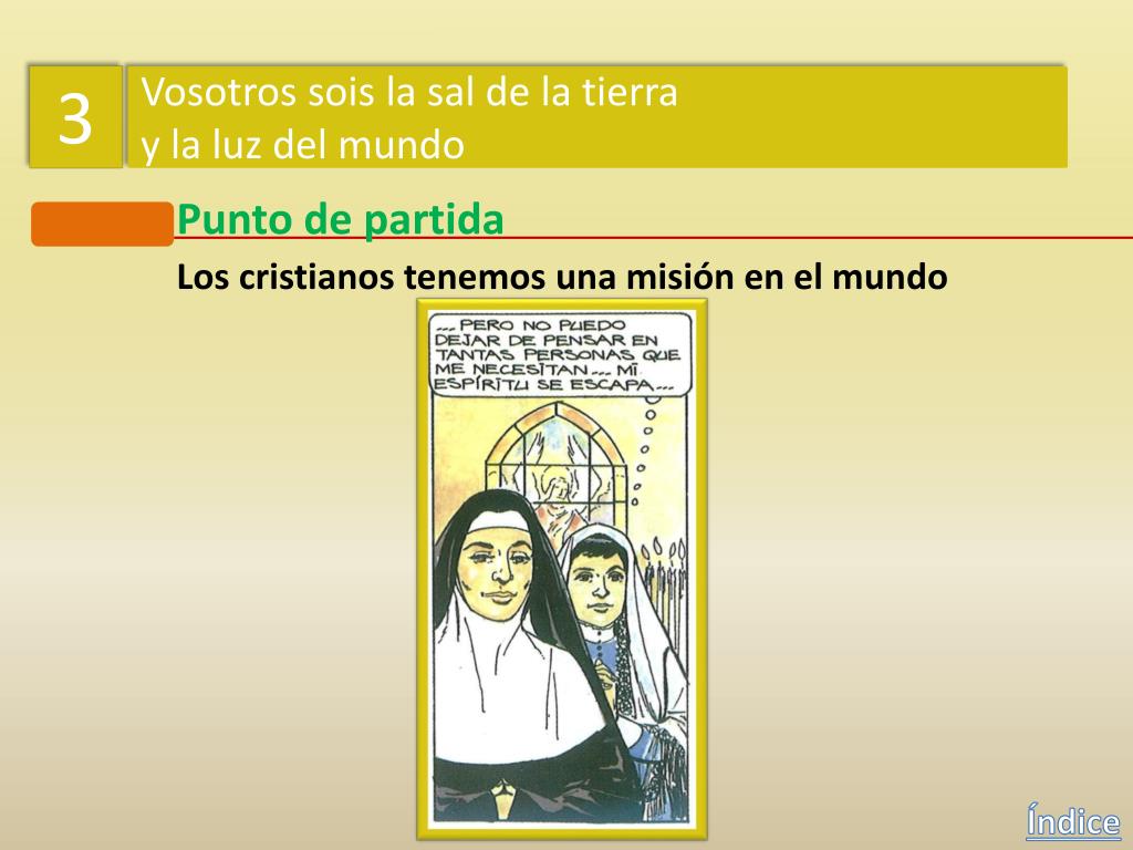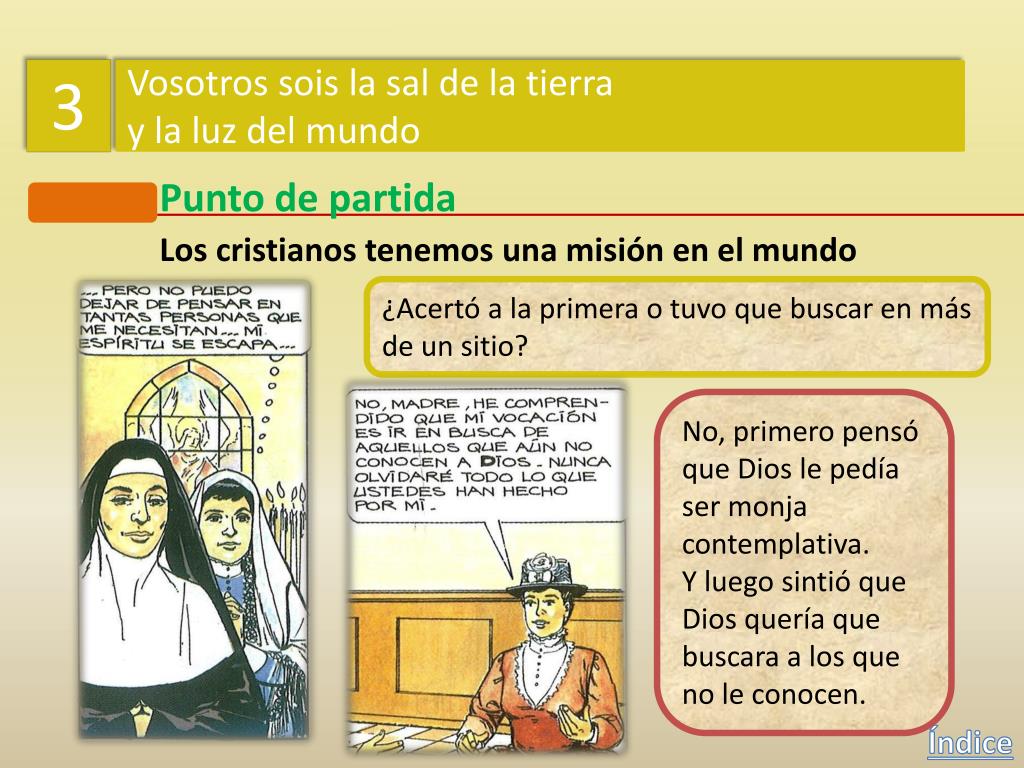 3 Vosotros sois la sal de la tierra y la luz del mundo Punto de partida Los cristianos tenemos una misión en el mundo ¿Acertó a la primera o tuvo que buscar en más de un sitio? No, primero pensó que Dios le pedía ser monja contemplativa. Y luego sintió que Dios quería que buscara a los que no le conocen. Índice