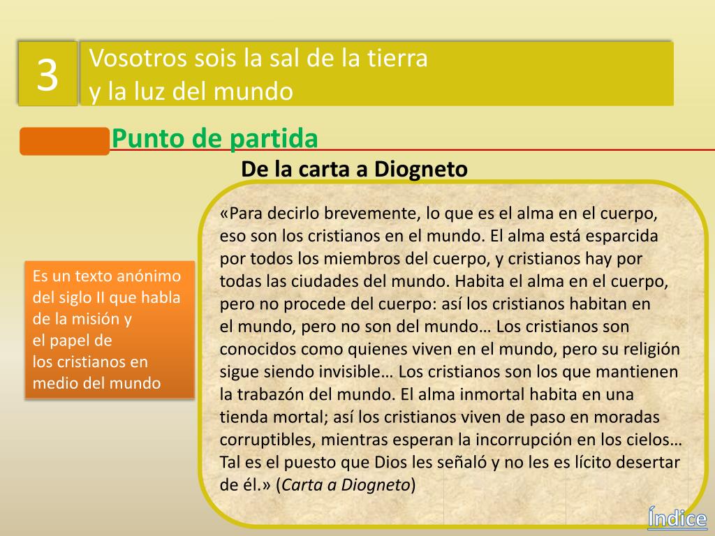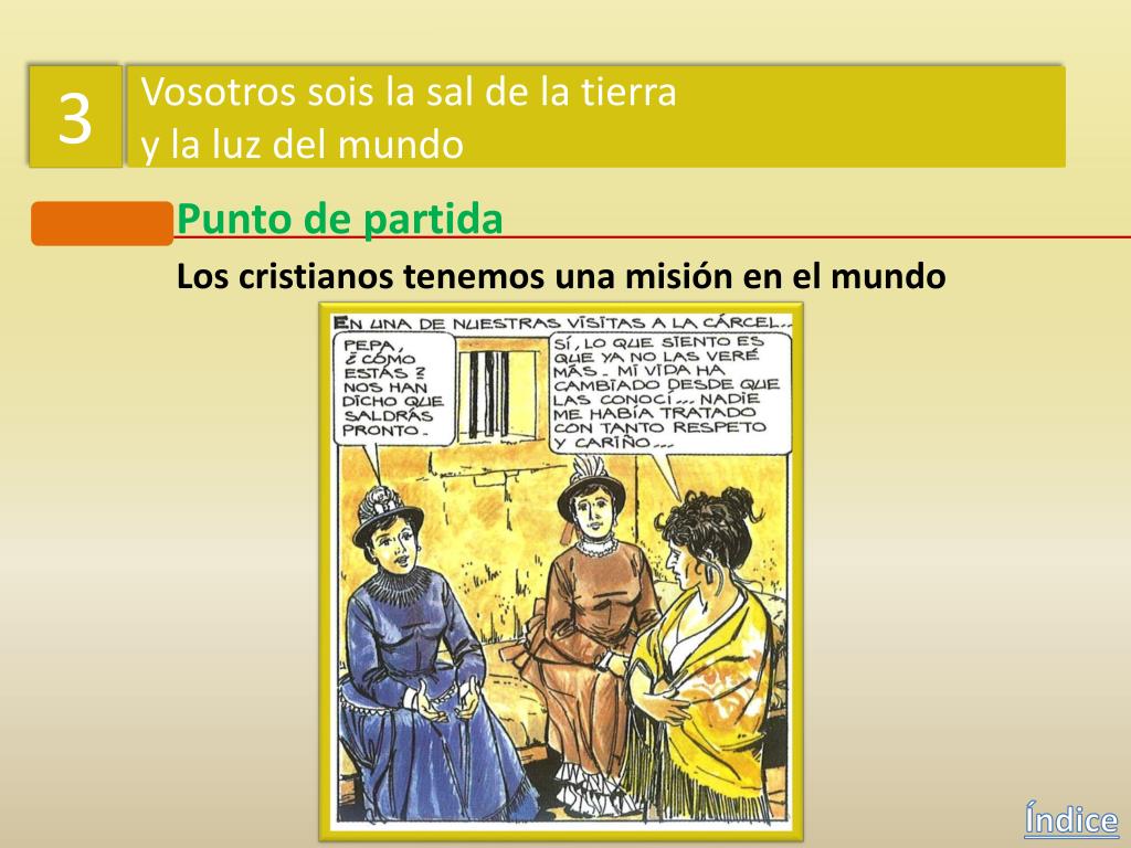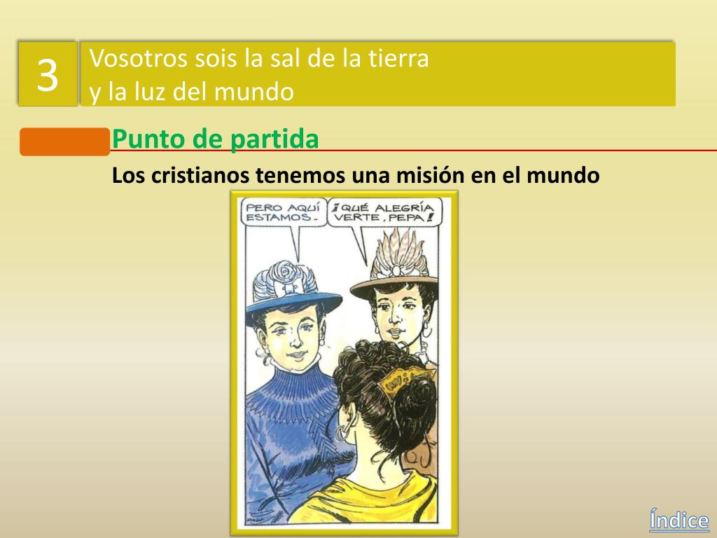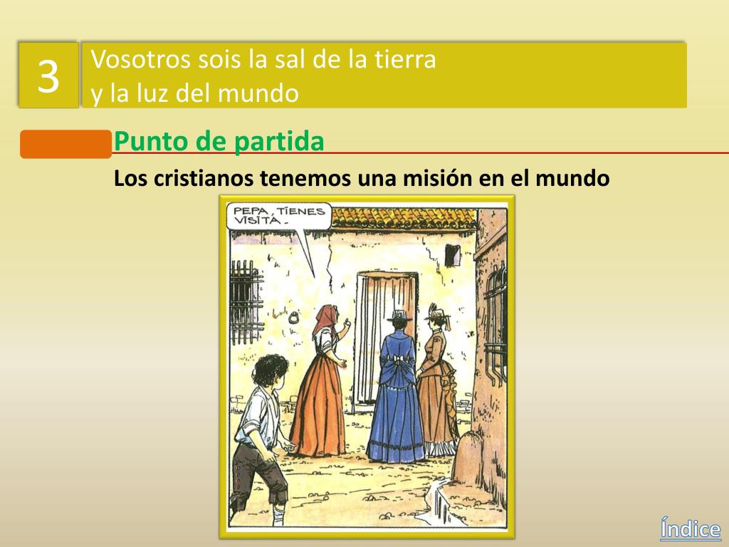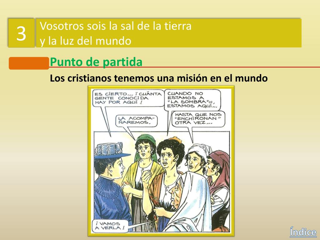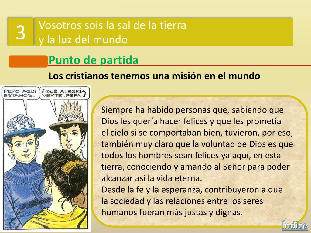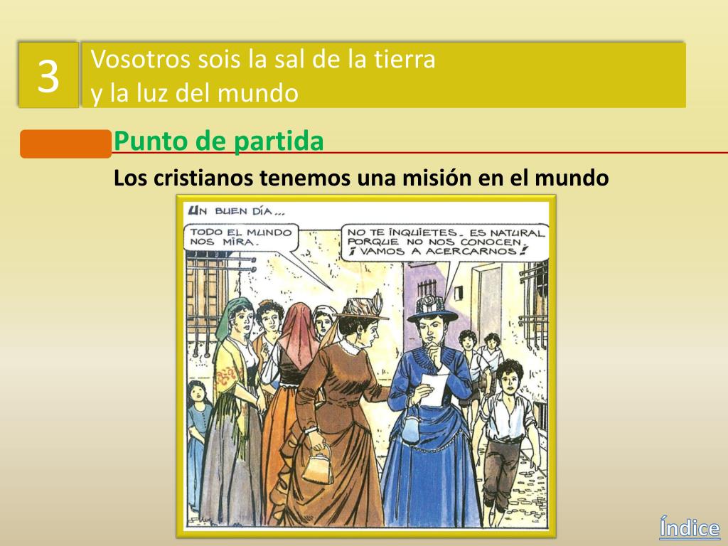 3 Vosotros sois la sal de la tierra y la luz del mundo Punto de partida Los cristianos tenemos una misión en el mundo Índice