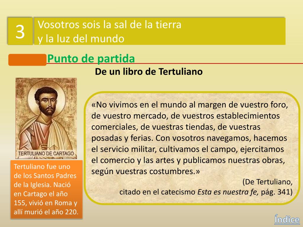 3 Vosotros sois la sal de la tierra y la luz del mundo Punto de partida De un libro de Tertuliano «No vivimos en el mundo al margen de vuestro foro, de vuestro mercado, de vuestros establecimientos comerciales, de vuestras tiendas, de vuestras posadas y ferias. Con vosotros navegamos, hacemos el servicio militar, cultivamos el campo, ejercitamos elcomercio y las artes y publicamos nuestras obras, según vuestras costumbres.» (De Tertuliano, citado en el catecismo Esta es nuestra fe, pág. 341) Tertuliano fue uno de los Santos Padres de la Iglesia. Nació en Cartago el año 155, vivió en Roma y allí murió el año 220. Índice