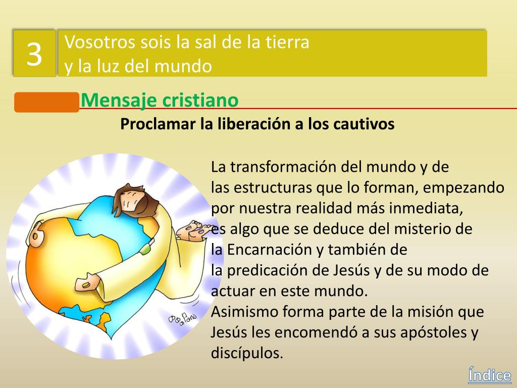 3 Vosotros sois la sal de la tierra y la luz del mundo Mensaje cristiano Proclamar la liberación a los cautivos La transformación del mundo y de las estructuras que lo forman, empezando por nuestra realidad más inmediata, esalgo que se deduce del misterio de laEncarnación y también de lapredicación de Jesús y de su modo de actuar en este mundo. Asimismo forma parte de la misión que Jesús les encomendó a sus apóstoles y discípulos. Índice