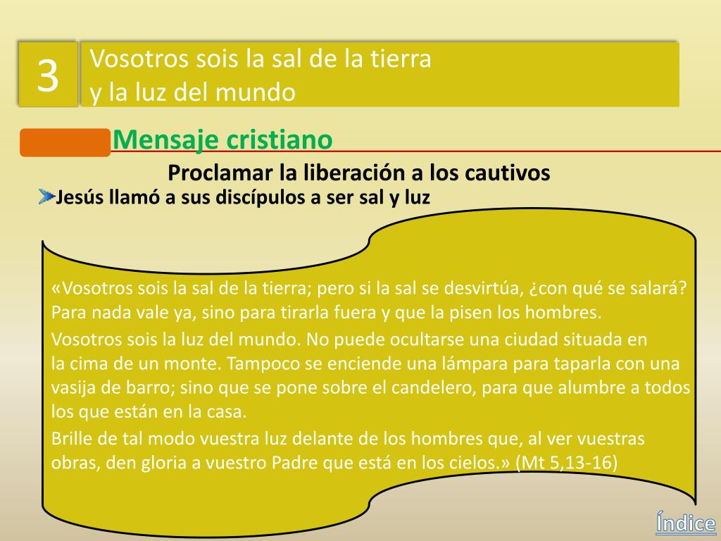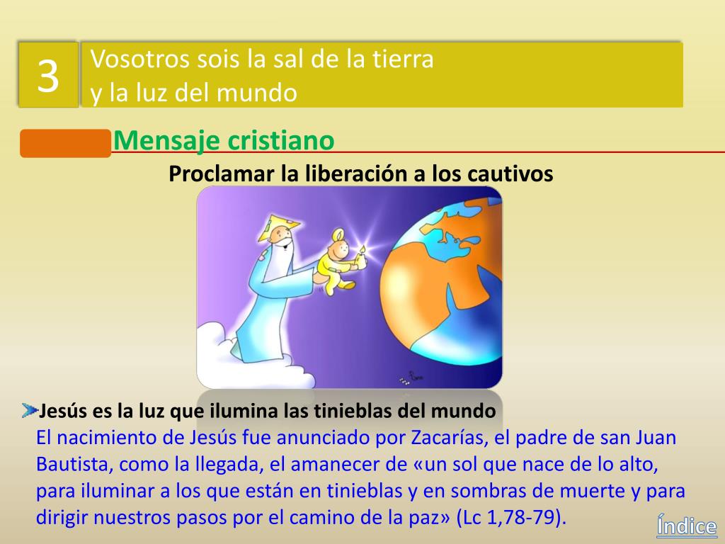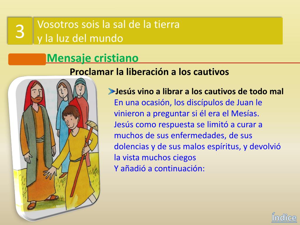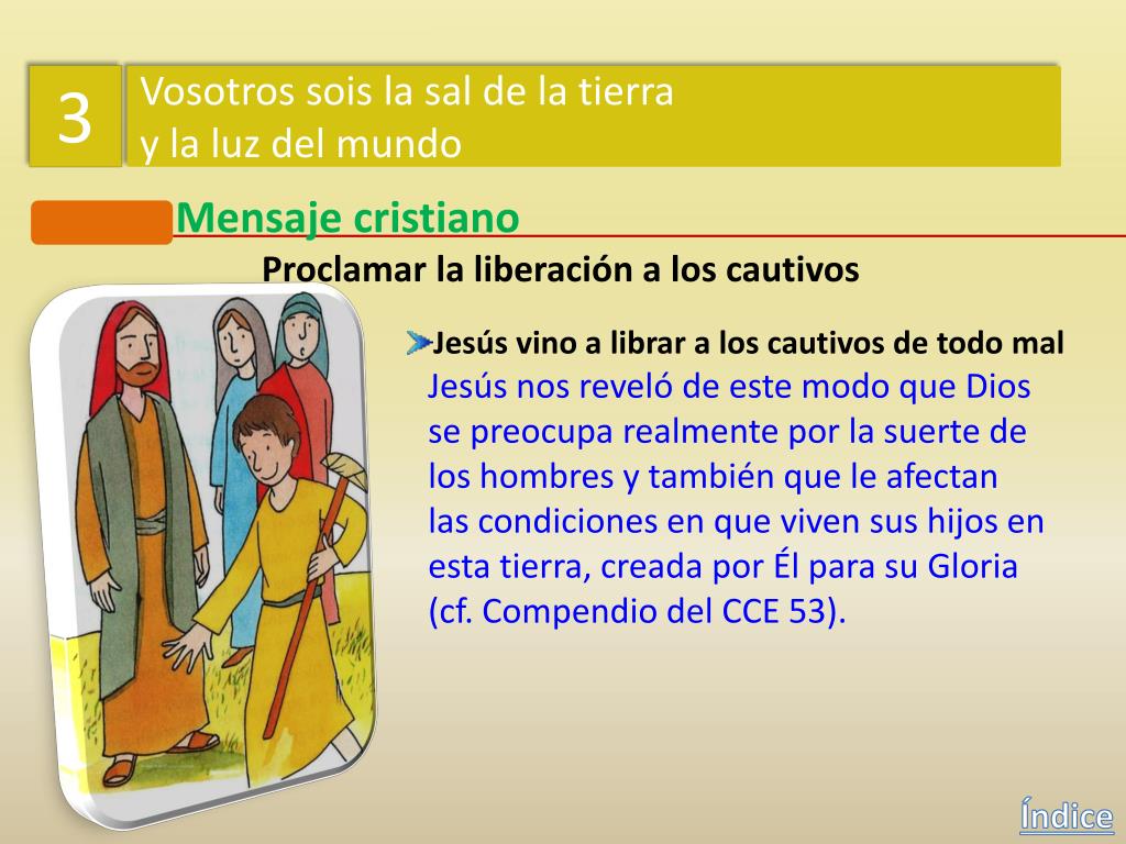 3 Vosotros sois la sal de la tierra y la luz del mundo Mensaje cristiano Proclamar la liberación a los cautivos Jesús vino a librar a los cautivos de todo mal Jesús daba a entender así que la misión que recibió del Padre de salvar a loshombres y de anunciar la llegada del Reino de Dios prometido para el tiempo mesiánico, se hacía también visible en latransformación de las condiciones de vida de los más desfavorecidos: pobres,cautivos, ciegos y oprimidos. Índice