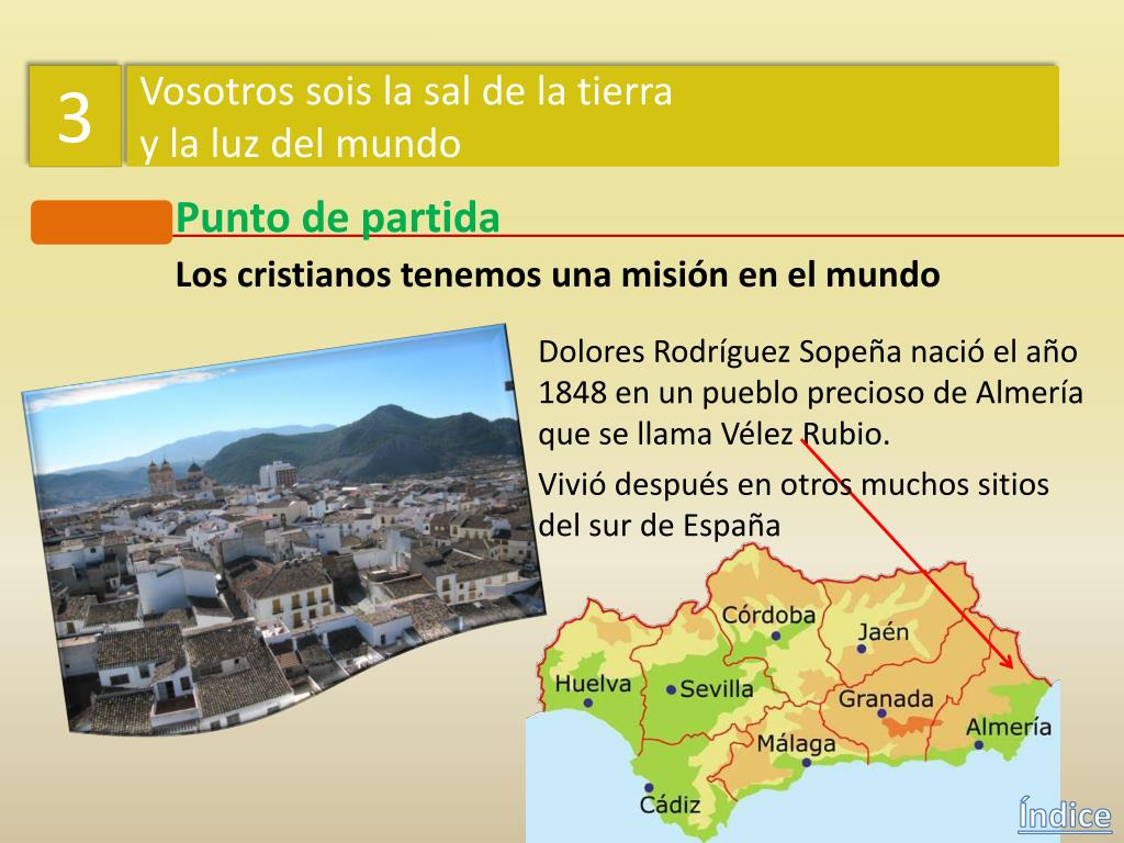 3 Vosotros sois la sal de la tierra y la luz del mundo Punto de partida Los cristianos tenemos una misión en el mundo Dolores Rodríguez Sopeña nació el año 1848 en un pueblo precioso de Almería que se llama Vélez Rubio. Vivió después en otros muchos sitios del sur de España Índice